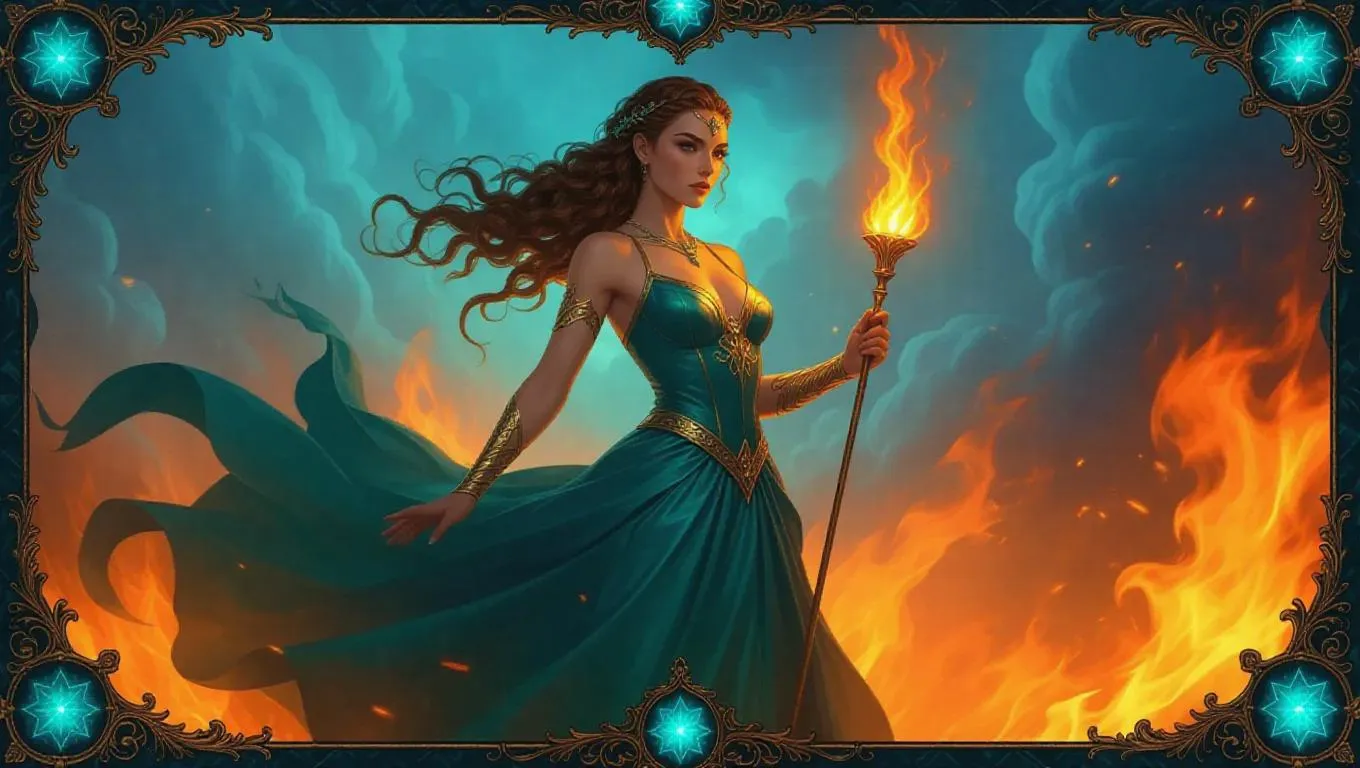 A fiery goddess with braided chestnut hair, wearing a molten teal gown that shifts hues with the light. She holds a blazing torch while standing amidst roaring flames. The background showcases a whirlwind of fiery clouds in a blue sky. The card border integrates intricate flame and sunburst motifs, accented with cool teal and fiery orange decorations, and adorned with radiant sapphire.