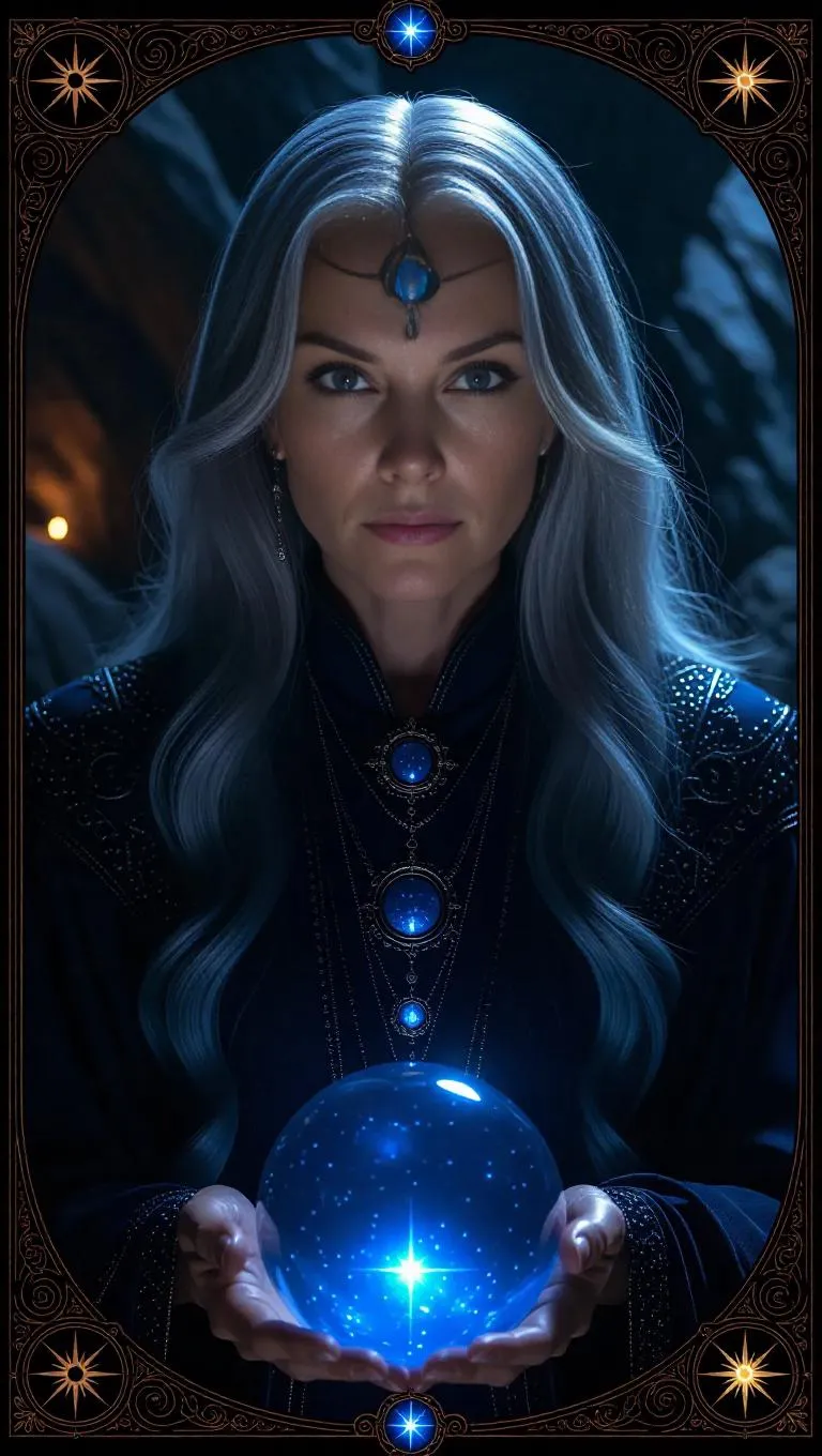 A wise female oracle with long, silver hair and piercing, all-seeing indigo eyes, robed in a flowing garment adorned with lunar symbols and a crystal ball. She gazes into the future, surrounded by swirling mist and glimpses of different timelines. The mystical cave background features glowing stars and ancient maps, encased in an ornate stone border with divination symbols and oracle emblems, exuding a rich, aged texture. Ethereal glows and night-like, mysterious lighting enhance the sense of prophecy, creating a captivating scene reminiscent of collectible card games.