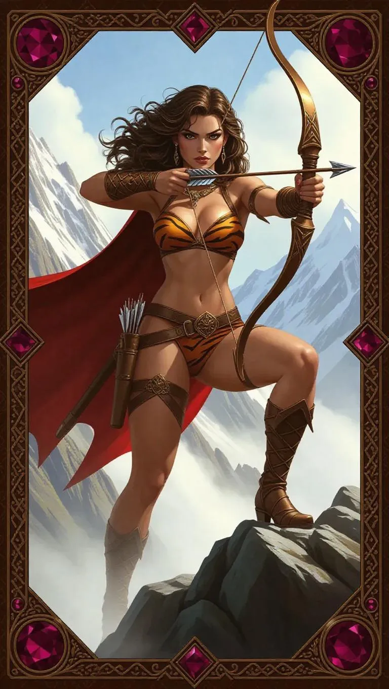 A fierce huntress with elegantly curled hair, wearing a fierce tiger-striped bikini and a lightweight cape. She holds a powerful crossbow, ready to strike, while standing on a rocky mountaintop. Majestic peaks and swirling mists frame the scene. The card border features geometric patterns and floral motifs, accented with earthy brown and vibrant red decorations, and adorned with sparkling rubies.