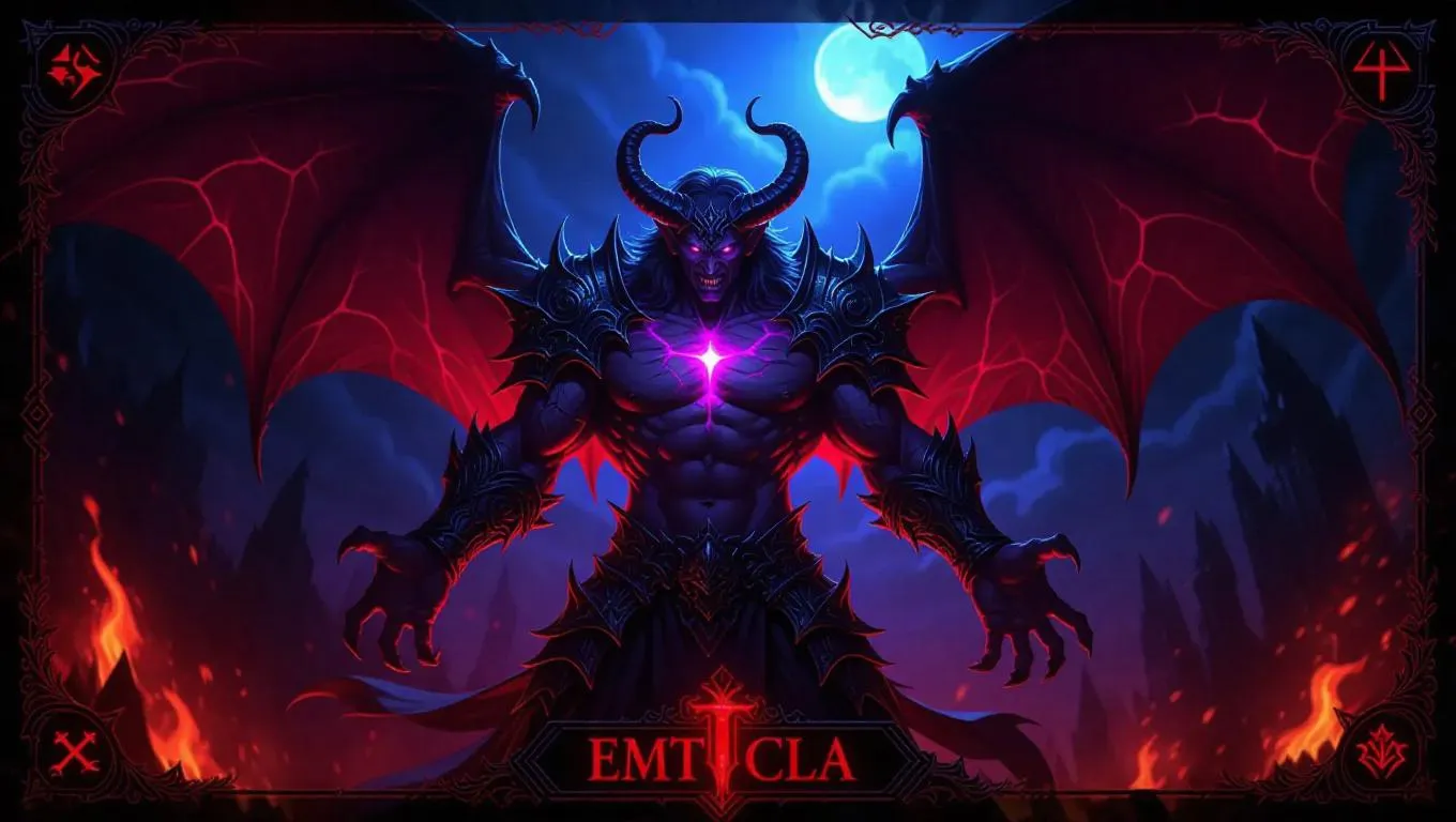 A shadowy demon lord rises from an eldritch chasm, his expansive wings stretching wide, shimmering red horns brightening, and glowing fuchsia veins striating his muscular form. Hellfire and ruin surround him, with wicked glyphs and a thick ebony border adorned with glistening lava cracks framing the scene. A legendary card emblem in the corner adds to the mysterious charm. Dynamic lighting and dark shadows emphasize the extraordinary card effect.