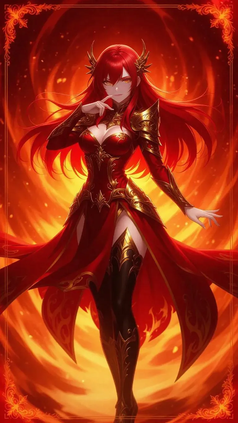 A fierce anime-style female sorceress, clad in a regal red and gold outfit adorned with intricate flame-like patterns, strikes a commanding pose. Her long crimson hair cascades like liquid fire, and her glowing orange eyes blaze with intense determination. The background is a swirling inferno with radiant embers, framed by a fiery red border with holographic flame motifs.