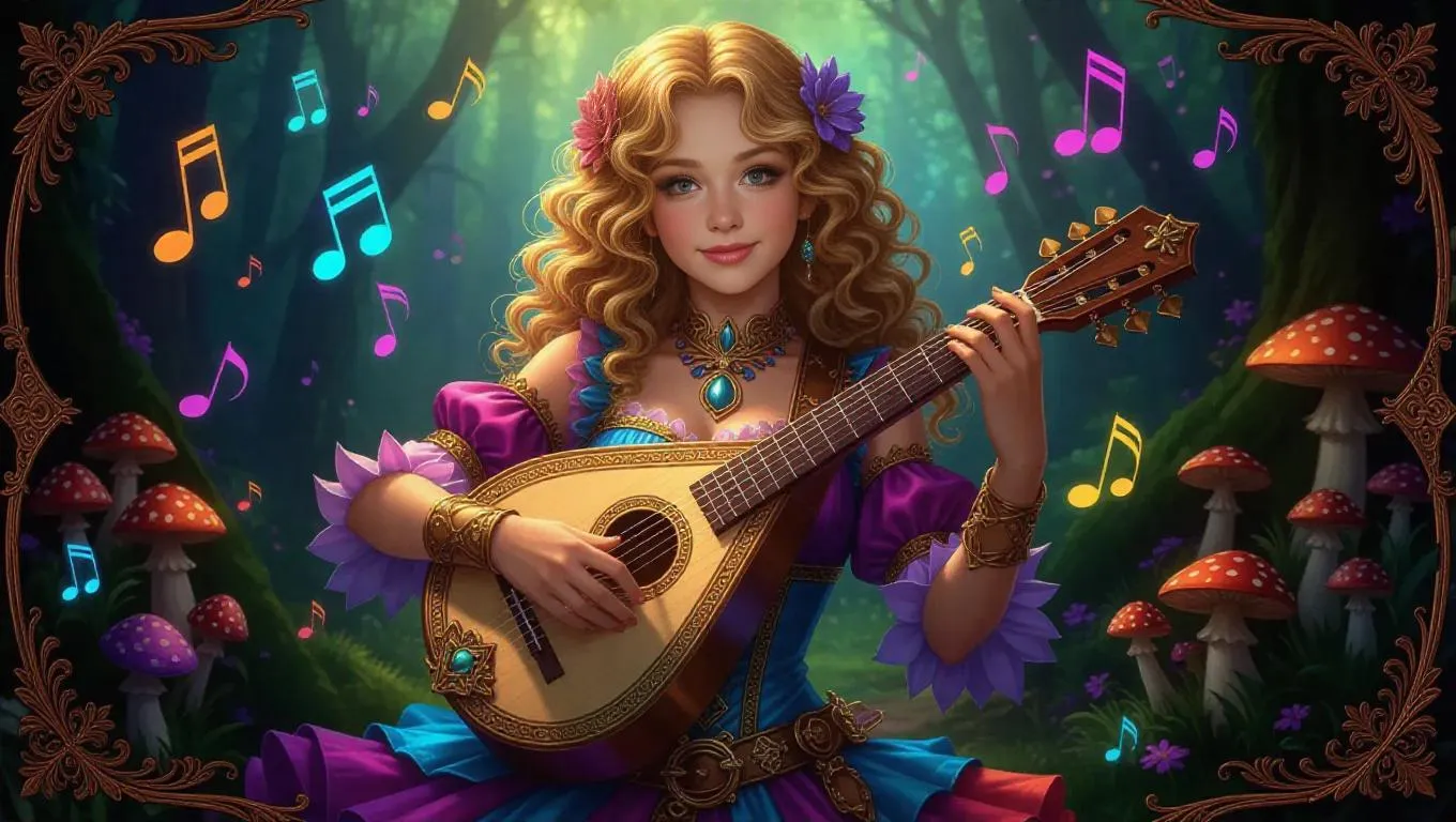A charming female bard with curly blonde hair and mischievous brown eyes, dressed in a vibrant, colorful outfit adorned with musical notes and feathers. She plays a magical lute, emitting melodious waves, surrounded by dancing fairies and musical symbols. The whimsical forest background is filled with glowing mushrooms and talking animals, encircled by a delicate wooden border with floral carvings and musical emblems. Warm lighting, gentle glows, and a playful charm create a delightful, finely detailed scene in the style of collectible card games.