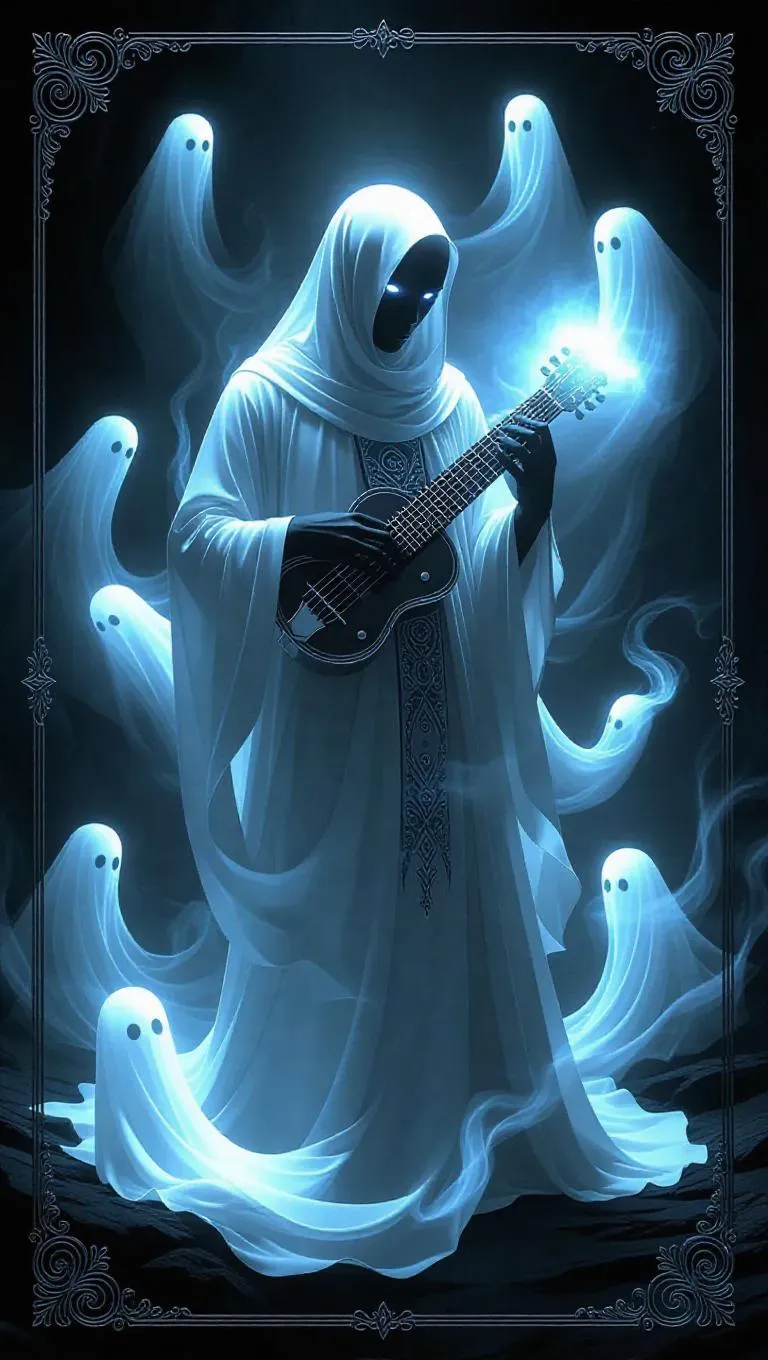 A spectral kazoo player in flowing transparent robes plays a cursed melody, summoning flickering ghosts and spectral lights. The scene is enveloped in eerie mist, framed by silver borders adorned with luminous musical script. Soft, enchanting side light enhances the translucent quality of the robes and spirits, creating a hauntingly beautiful atmosphere. The style is whimsical and surreal, blending realism with supernatural elements.