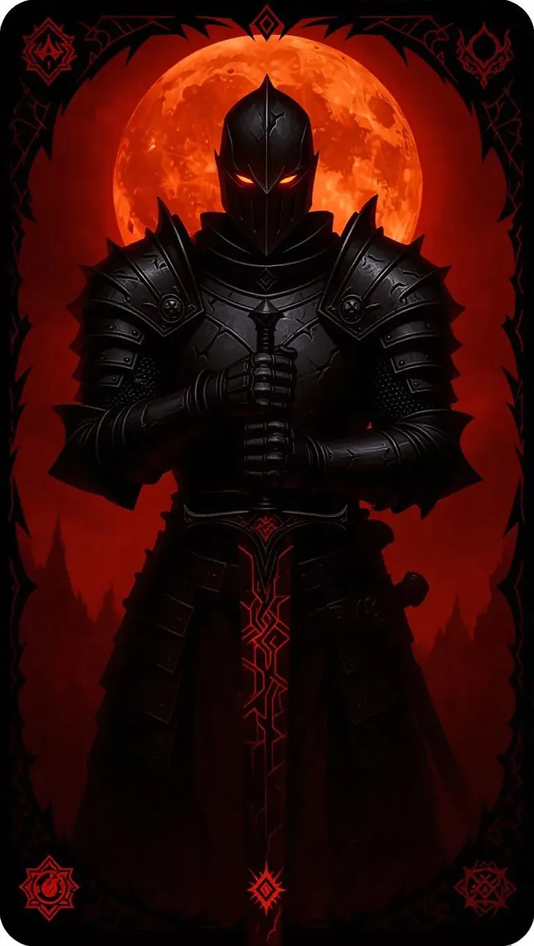 A corrupted knight stands under a blood moon, his tarnished armor and cursed black sword reflecting the eerie glow. His single glowing orange eye pierces the darkness. The game card border features jagged tribal shapes, muted black tones, blood runes, and a legendary shadow-element mark with pulsating glowing effects. Side light casts intricate shadows, enhancing the knight's ominous presence. Style: Dark fantasy.