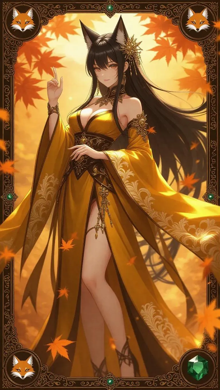 A majestic anime-style female empress, dressed in a flowing yellow and bronze robe adorned with intricate fox motifs, stands in a commanding pose. Her long black hair is styled with elegant bronze hairpins, and her glowing hazel eyes radiate unparalleled power. The background showcases a swirling fox and warm autumn leaves. The card border is ornate, featuring intricate fox and leaf patterns, engraved Chinese characters, a holographic shimmer, and accented with jade gemstones and bronze filigree.