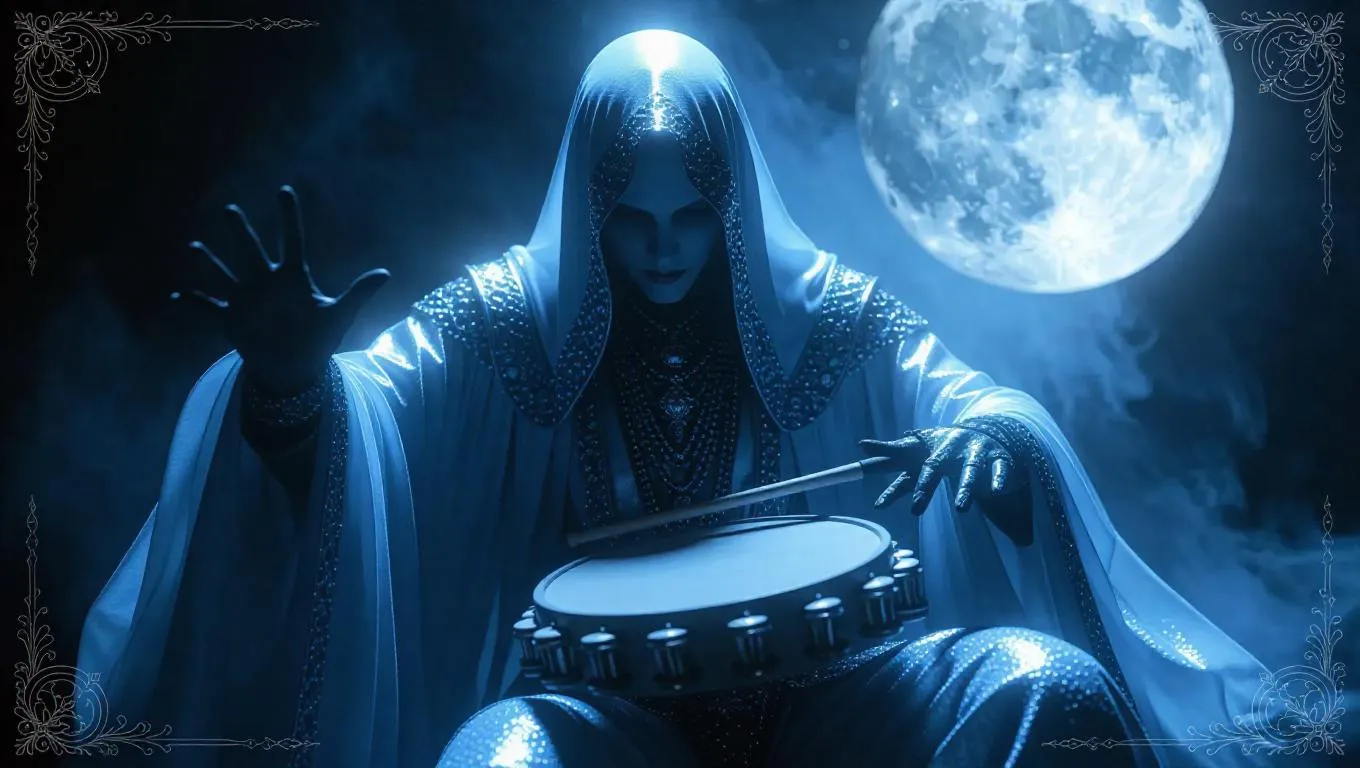 A ghostly tambourine player in silver-trimmed garments plays a cursed melody, summoning flickering spectres and luminous lights. The scene is veiled in misty haze, framed by shimmering borders adorned with arcane symbols. Soft, moonlit light enhances the airiness of the garments and spirits, creating a hauntingly beautiful atmosphere. The style is enchanting and otherworldly, blending realism with supernatural elements.
