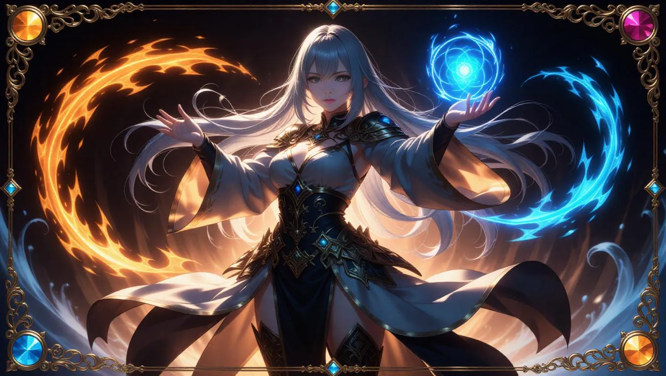 A stunning anime-style female mage, dressed in flowing robes adorned with elemental symbols, stands in a dynamic pose, casting a spell. Her long silver hair glows with a faint blue light, and her piercing green eyes radiate power. Swirling water, fire, and wind elements surround her, with glowing runes floating in the air. The card border is ornate, with intricate gold filigree, embedded gemstones, and holographic shimmer, framed by swirling elemental motifs.