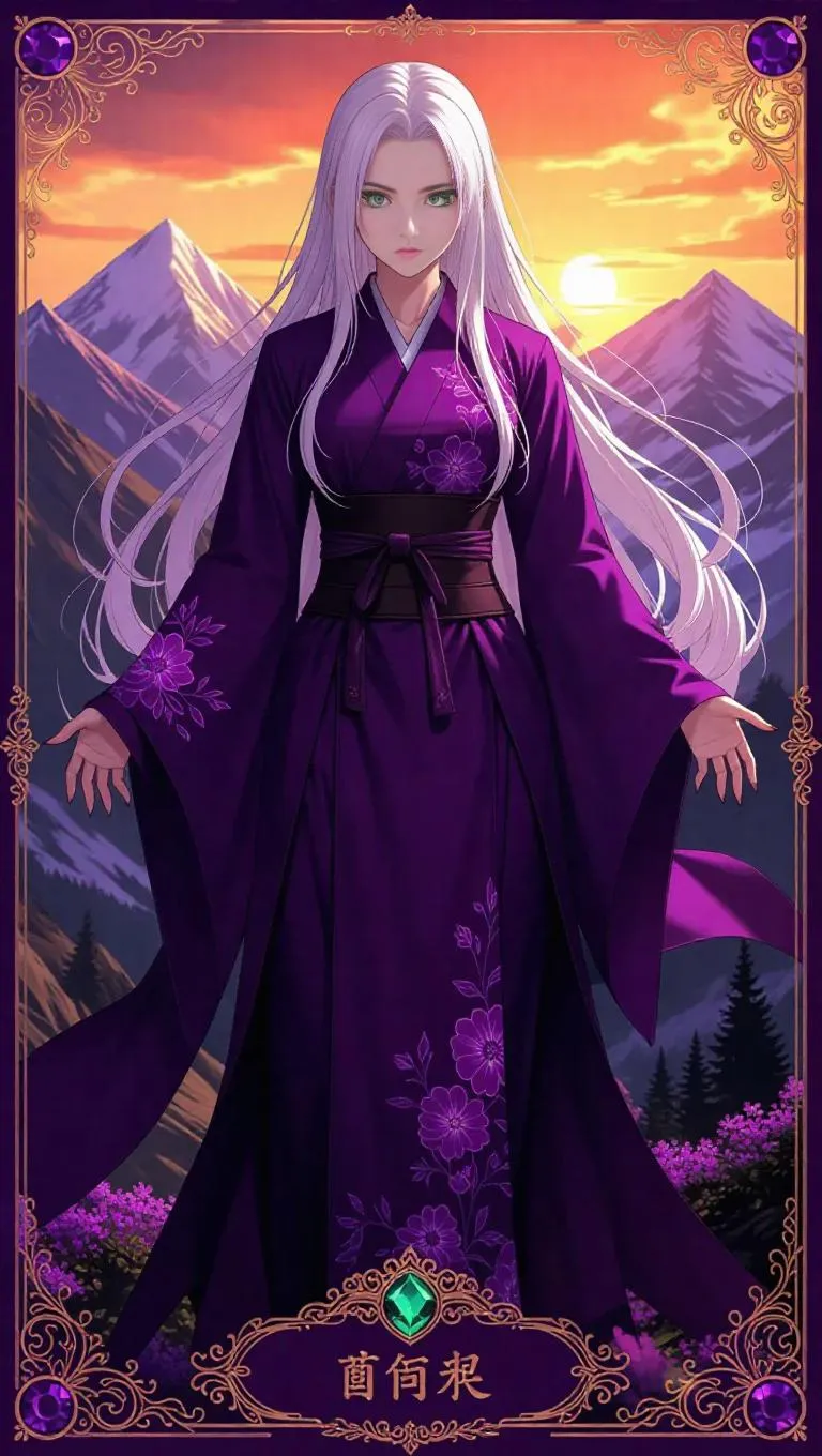 A determined anime-style female monk, clad in a deep purple robe with elegant floral patterns, stands in a fierce pose. Her long white hair flows gracefully, and her fierce emerald eyes radiate power. The serene mountain backdrop is adorned with vibrant sunsets. The card border is intricate, featuring floral and vine motifs, embossed Italian characters, holographic sheen, amethyst gems, and golden filigree.