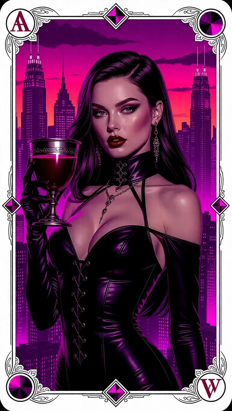 A seductive vampire with crimson tips on her lips, wearing a chic leather gown with metallic details, holds a heavy iron goblet of blood. Standing in a futuristic skyline at dusk, surrounded by towering skyscrapers and neon signs. The card border integrates geometric and abstract motifs, accented with silver and black decorations, and adorned with cosmic tourmalines.