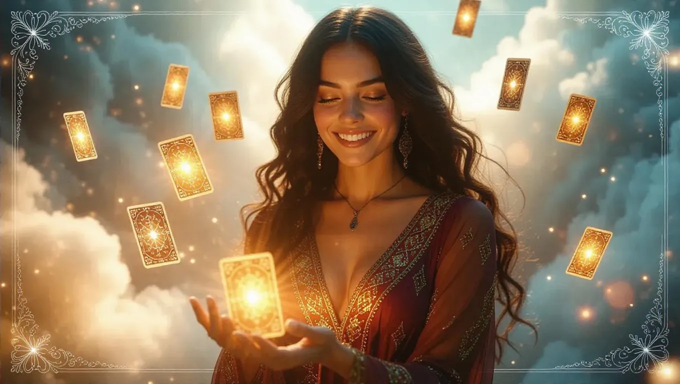 A mystical fortune teller with a joyous smile in a deep trance, surrounded by spinning, glowing tarot cards. She wears a regal gown with embroidered patterns, her hair flowing in long curls. The tarot cards emit a golden, radiant light, casting a glittering glow. The scene is enveloped in swirling clouds, set within a contemporary silver-etched card frame adorned with glimmering cosmic particles, elite class border icons, and vibrant color splash effects. Soft, radiant light enhances the mystical atmosphere, creating a lively and celebratory environment. Style: Fantastical realism.