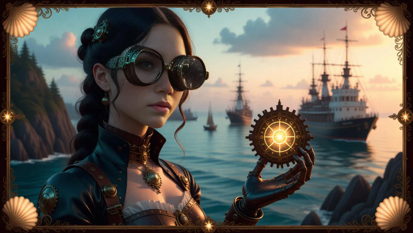 A steampunk inventor girl with a mechanical arm and vintage goggles holds a glowing gear-powered device. She stands in front of a coastal view filled with ships and lighthouses. The scene is framed with shell-themed borders and nautical emblems, bathed in a soft pastel glow. Detailed mechanical textures and retro travel poster design elements enhance the serene atmosphere. Gentle, warm side light highlights her creative spirit and the intricate gears, creating a peaceful yet adventurous feel.