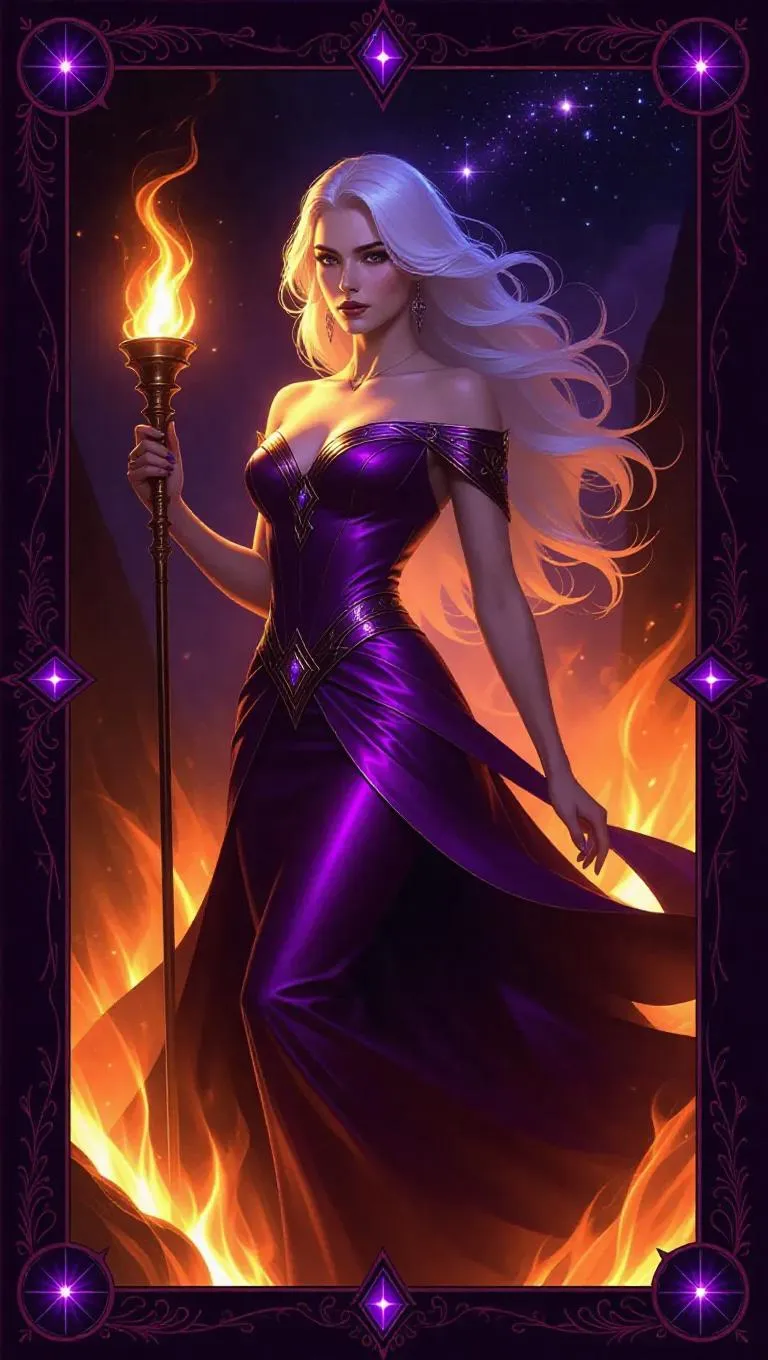 A fiery goddess with shoulder-length white hair, wearing a molten purple gown that reflects her divine nature. She holds a blazing torch while standing amidst roaring flames. The background showcases a starry night sky filled with fiery constellations. The card border integrates intricate flame and sunburst motifs, accented with deep purple and shimmering silver decorations, and adorned with radiant amethyst.