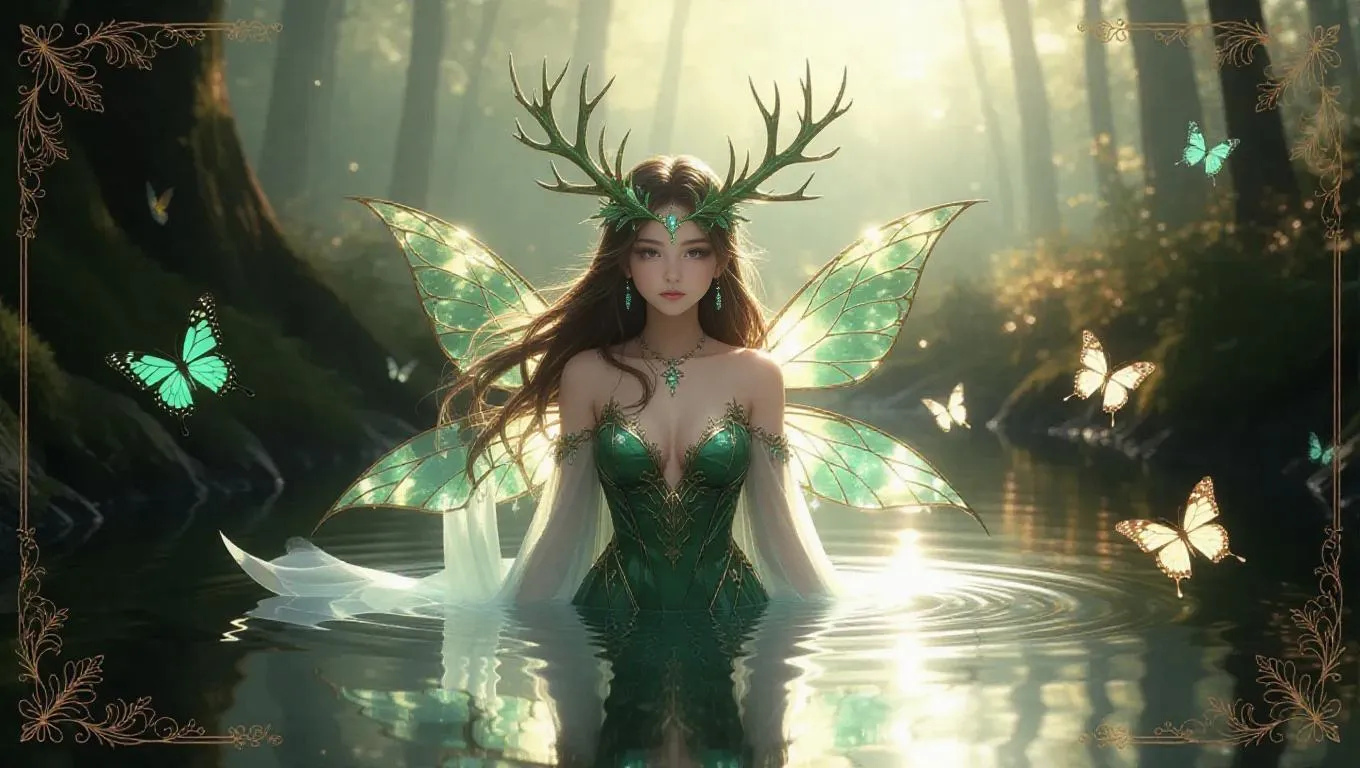 A forest spirit girl with green crystal antlers floats over a magical pond, surrounded by butterflies and glowing leaves. Her ethereal form is adorned with delicate, flowing robes, and her eyes sparkle with a serene, mystical glow. The pond reflects the enchanting forest, with soft, dappled sunlight filtering through the canopy. The collectible card features nature-themed filigree borders, leaf emblems, and a soft green-gold holographic shine, enhancing the ultra-detailed enchanted forest background.