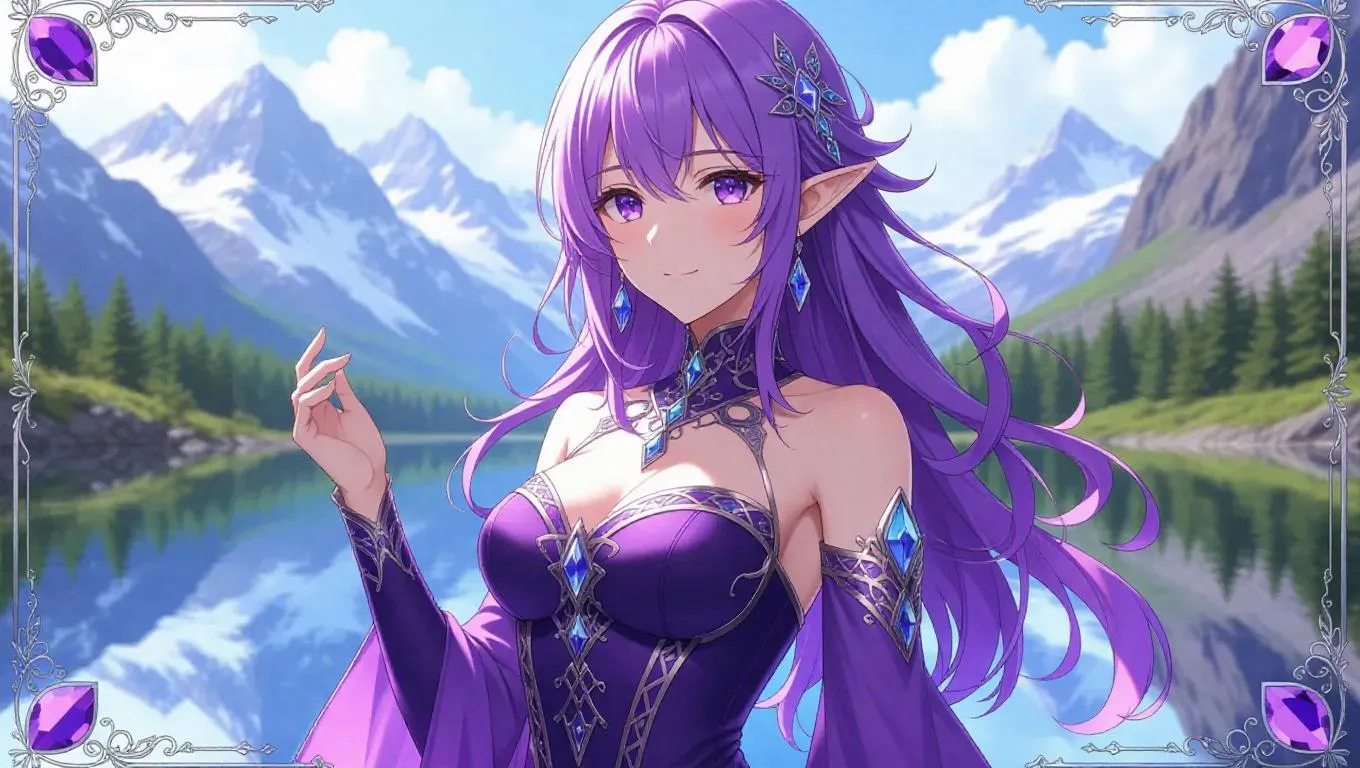 A serene anime-style female druid, adorned in a violet and silver outfit with intricate crystal patterns, stands in a graceful pose. Her wavy lavender hair is entwined with shimmering crystals, and her violet eyes radiate tranquility. The background showcases a mountainous landscape with sparkling lakes. The scene is framed by an ornate silver border with crystal motifs and a subtle shimmer.