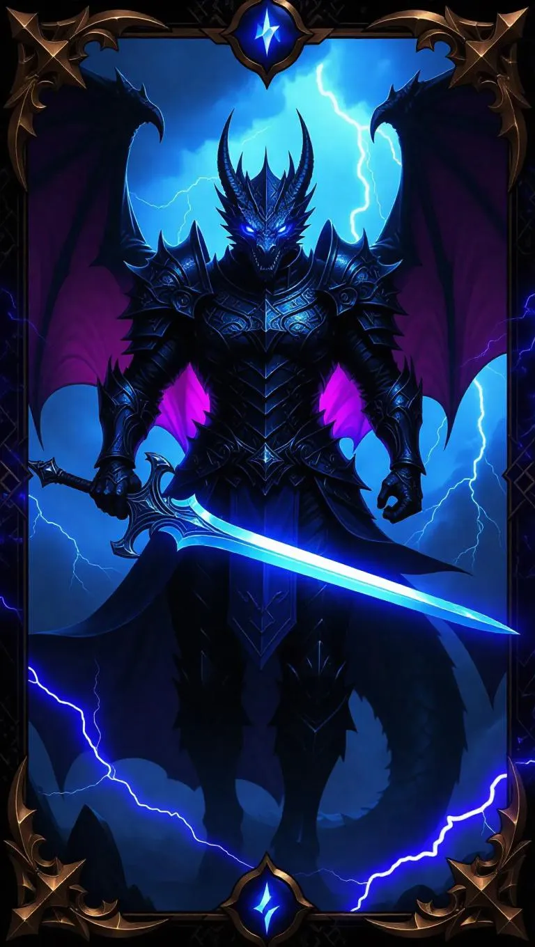 A dragon rider appears from the storm, wings massive and imposing, and a sword glowing with thunderous wrath. His armor glistens with electric energy, and the background features a tempestuous sky. The game card features a storm-themed border with lightning designs, metallic foil textures, and a vibrant bolt glow.