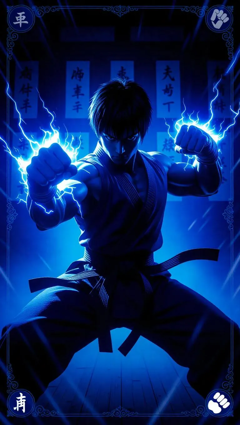 A determined martial artist with cropped black hair and an indigo aura strikes through dark energy. His fists are glowing as energy surges around him. The scene is set against a dojo, with traditional scrolls adorning the walls in the background. The card is framed with clean white borders, adorned with fist icons and dojo symbols, creating a high-quality SSR martial artist card effect. The lighting is focused and crisp, casting sharp highlights and emphasizing the disciplined action. The style is a fusion of martial tradition and modern action.