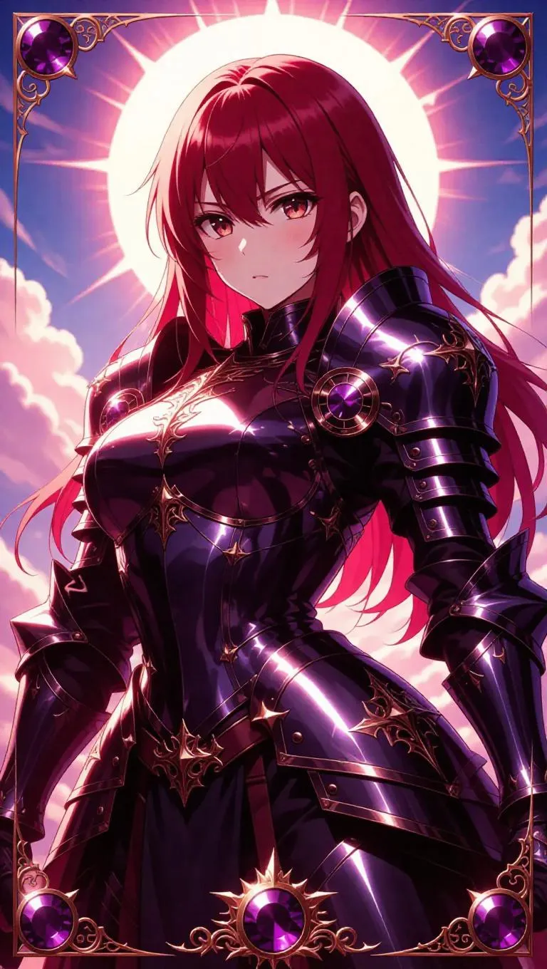 A fierce anime-style female knight, clad in glossy armor with intricate engravings, stands in a vigilant pose. Her fringe of red hair frames her face, and her deep brown eyes gleam with determination. The background features a noon sun casting intense rays, surrounded by bright clouds. The card border is radiant, with cosmic patterns, legendary symbols, and a holographic finish, accented by red vines and gleaming garnets.
