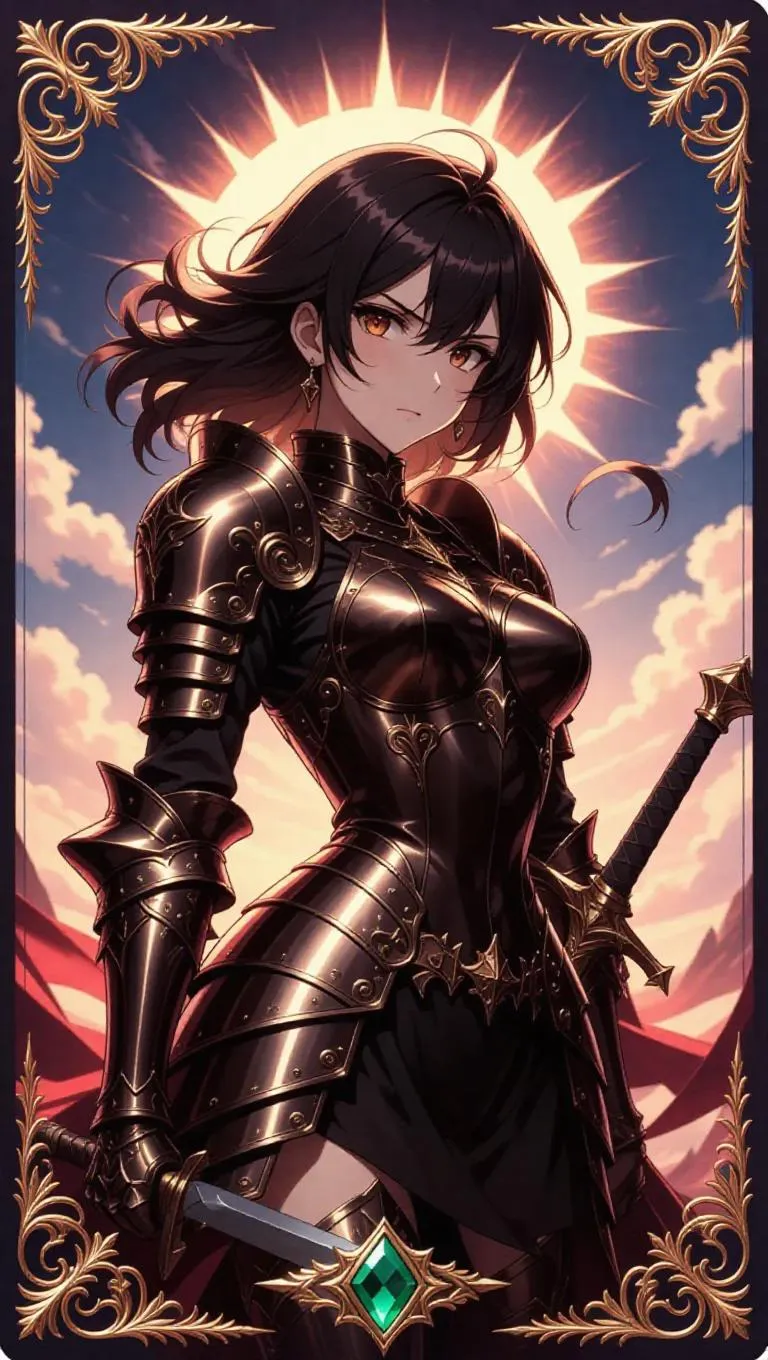 A fierce anime-style female knight, clad in sleek armor with intricate engravings, stands in a bold pose. Her wavy black hair is tied with a ribbon, and her fierce amber eyes gleam with determination. The background features a rising sun casting brilliant rays, surrounded by wispy clouds. The card border is radiant, with ornate patterns, mythical symbols, and a holographic finish, accented by silver vines and shimmering emeralds.