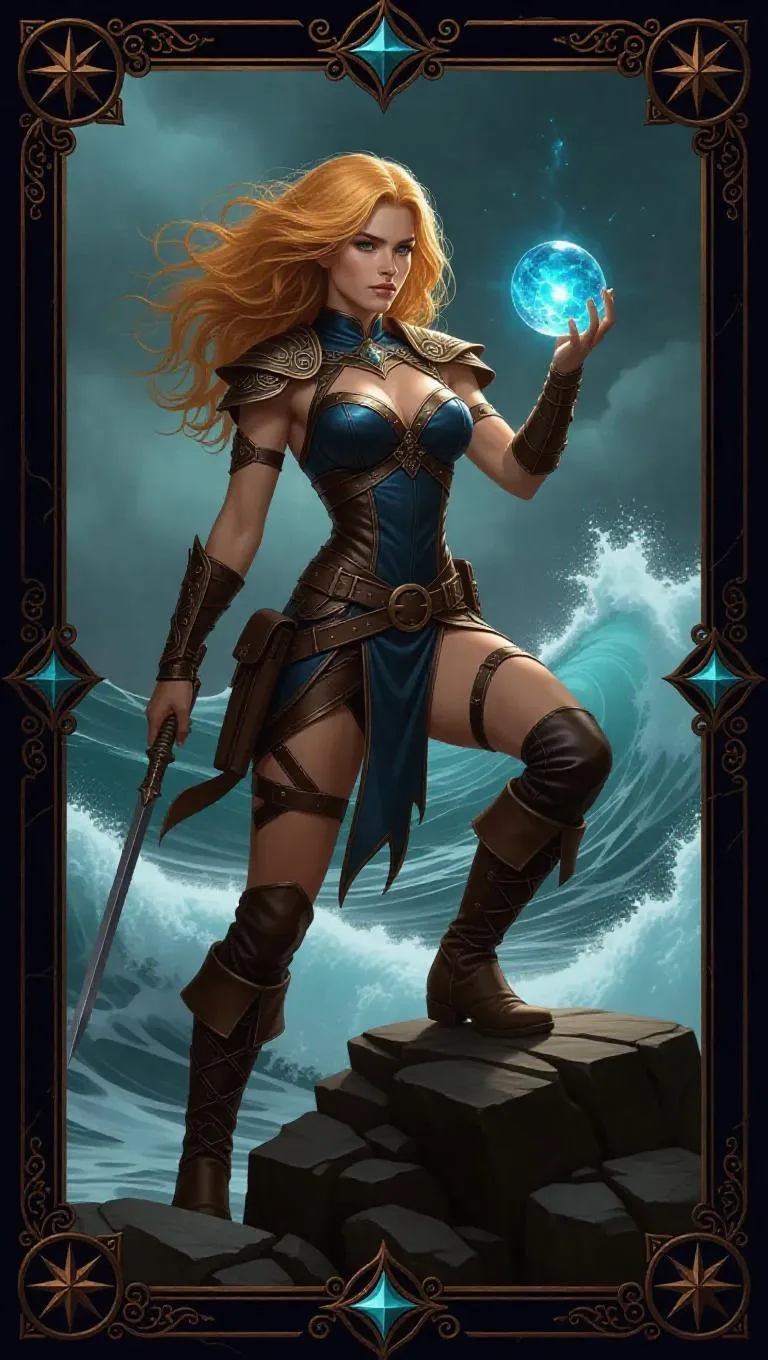 A daring sorceress with wild golden hair, clad in a warrior outfit with leather straps and boots, holds a glowing crystal orb while standing on a rocky outcrop. Stormy waves and crashing tides create a dramatic ambiance. The card border features compass and anchor motifs, accented with navy and bronze decorations, and adorned with aquamarine.