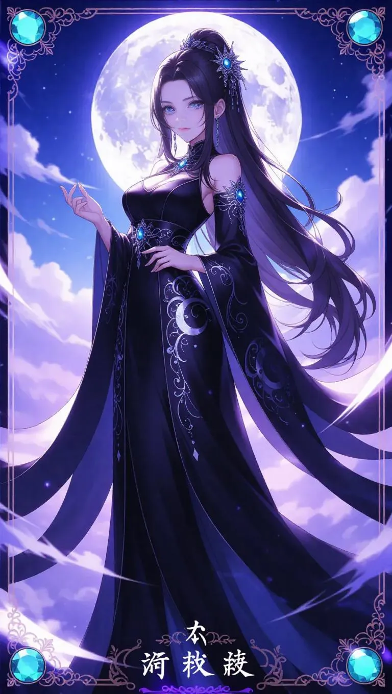 A majestic anime-style female empress, dressed in a flowing charcoal and silver robe adorned with intricate moon motifs, stands in a reflective pose. Her long wavy hair is styled with elegant silver hairpins, and her glowing silver eyes radiate unparalleled power. The background showcases a swirling moon and twilight skies. The card border is ornate, featuring intricate moon and twilight patterns, engraved Chinese characters, a holographic shimmer, and accented with jade gemstones and silver filigree.