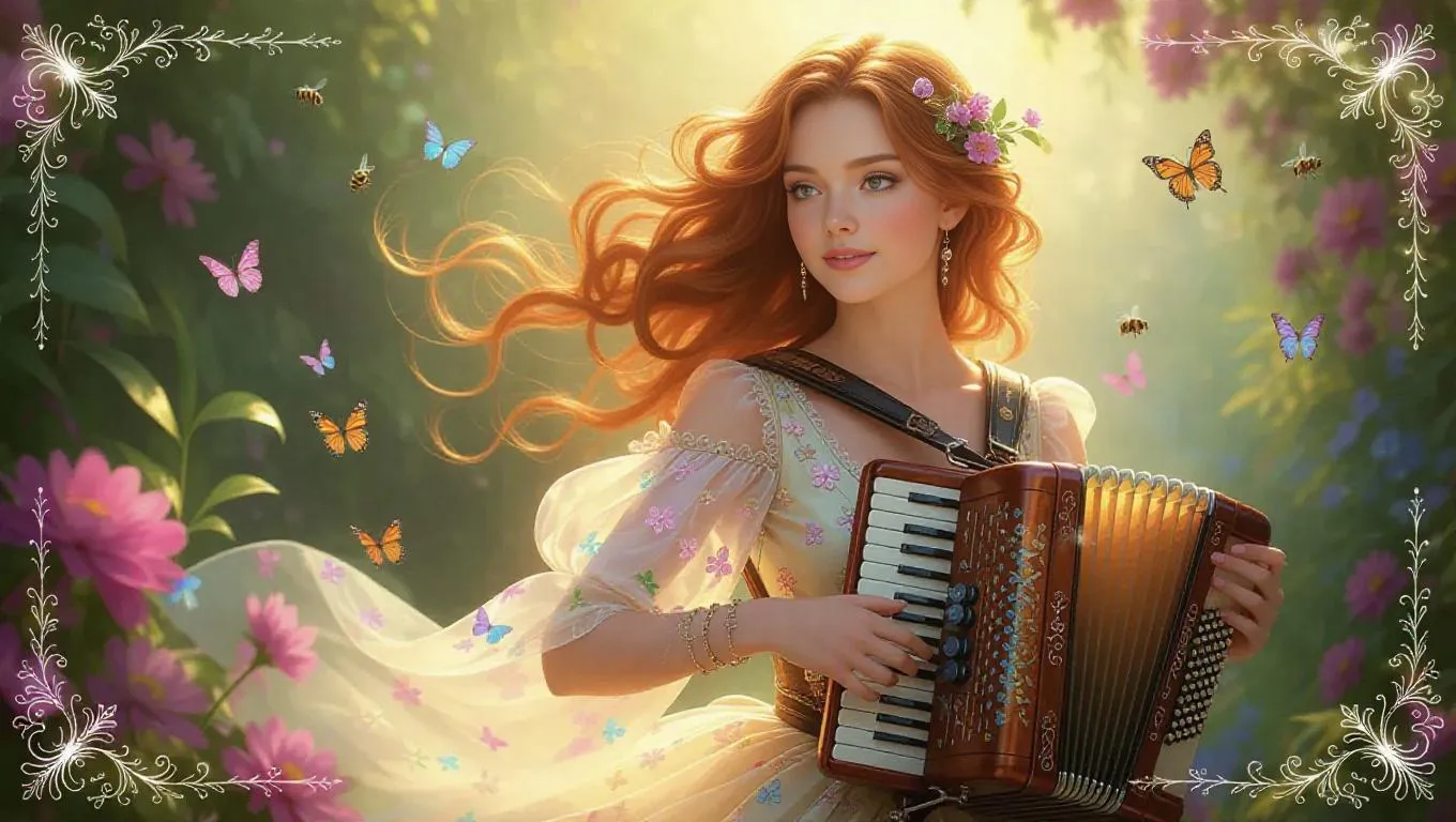 A graceful female bard with flowing auburn hair and curious gray eyes, dressed in a flowing, pastel outfit adorned with butterflies and floral patterns. She plays a whimsical accordion, releasing joyous tunes, surrounded by colorful blossoms and fluttering wings. The vibrant garden background is filled with lush greenery and busy bees, encircled by a delicate lace border with nature motifs and musical notes. Bright lighting, cheerful hues, and a lively charm create a bright, cheerful scene in the style of children's illustrations.