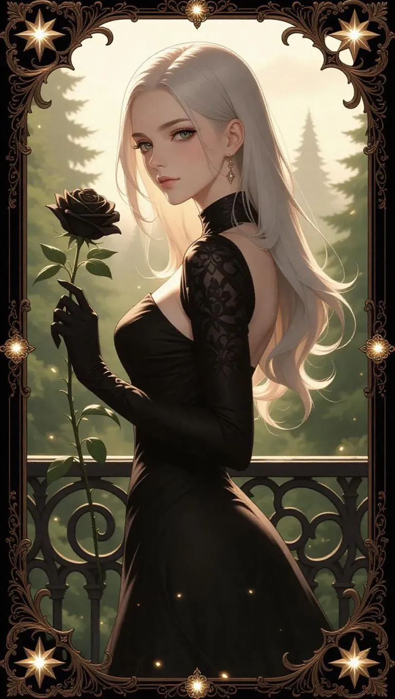 A mysterious queen with sleek platinum hair, wearing a chic gown with structured bodice, holds a black rose while standing on a wrought-iron balcony overlooking a calm morning sky. The background showcases a lush, enchanted forest with bright fireflies. The card border features intricate scroll and star motifs, accented with gold and cream decorations, and adorned with sparkling citrines.