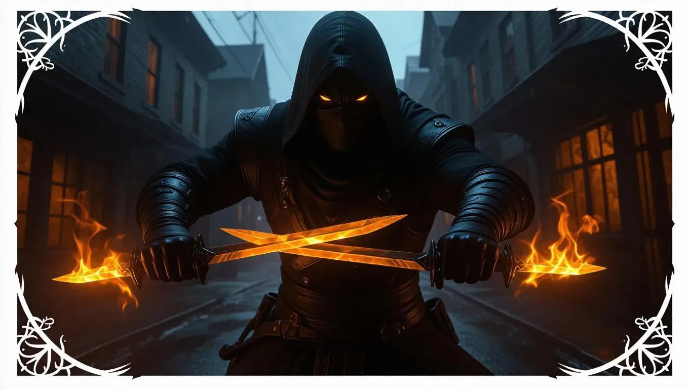 A mysterious masked rogue stands enveloped in shadow mist, holding twin blades of fire. His glowing orange eyes pierce through the darkness. Suburban streets and eerie shadows form the background. The scene is bathed in soft, twilight light, enhancing the eerie atmosphere. The card features stealth-themed white-on-black accents with sharp borders, adding a sharp, menacing edge. Style: Dark fantasy.