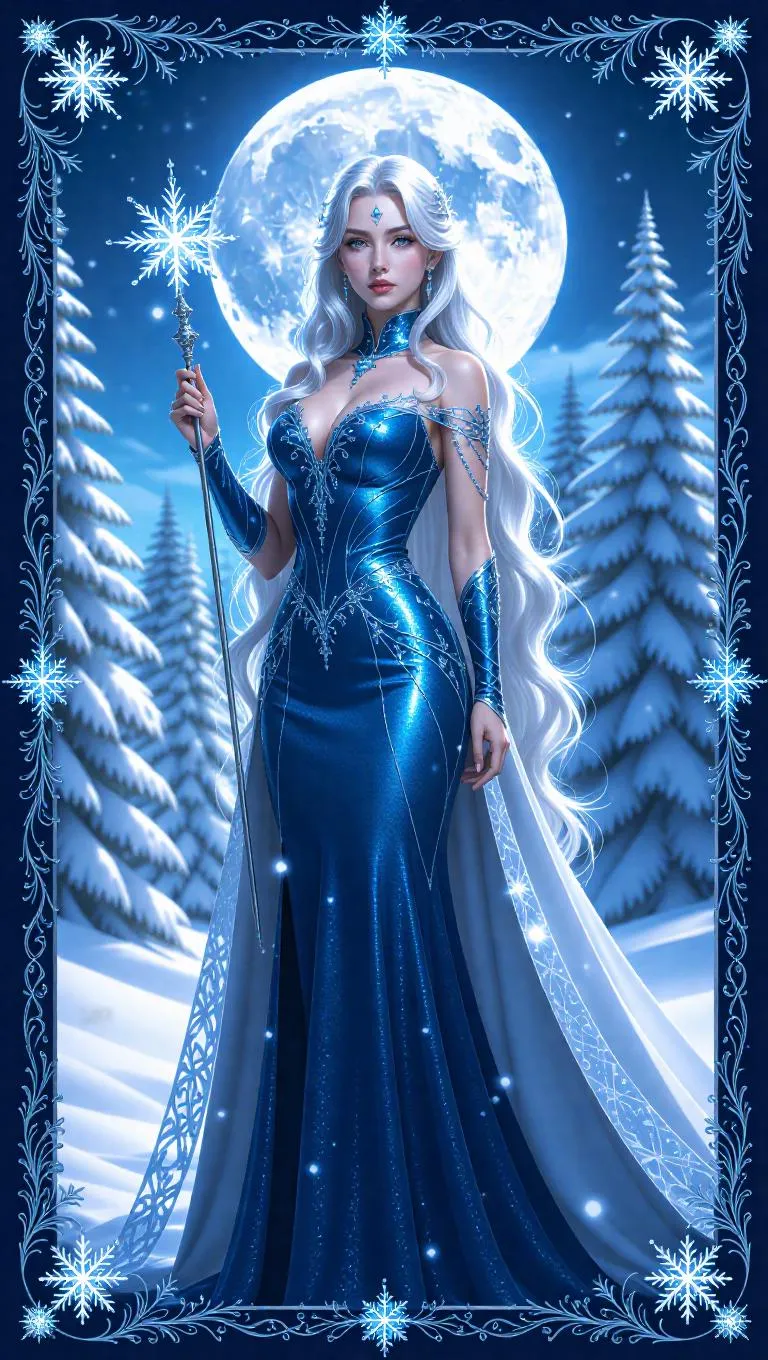 A regal ice queen with majestic long silver hair, adorned in a shimmering gown that reflects the colors of winter. She holds a frost-tipped wand, standing majestically in a winter wonderland. Snow-capped trees and a bright moon create an enchanting backdrop. The card border features intricate snowflake and crystal designs, accented with icy blue and gray, and embellished with sparkling jewels.