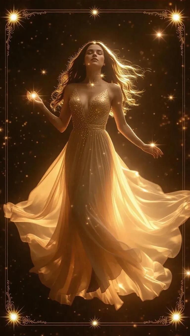 A celestial sorceress floats in space, her long warm beige hair blending seamlessly with the cosmos. She wears a dress woven from sunshine, casting radiant star spells from her fingertips. The background features expanding solar flares, while the card is framed with a bright border adorned with soft glows and light-catching textures. Soft, golden light illuminates her from the front, creating a gentle contrast with the dark, star-studded backdrop. The style is cheerful and radiant, blending realism with magical elements.