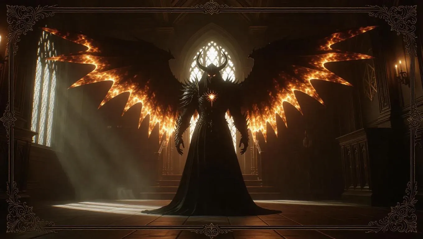 A demonic overlord with massive flaming wings and a shattered halo stands in a haunted mansion. His imposing figure exudes dark power, with dusty textures and ghostly apparitions surrounding him. The scene is bathed in deep browns and grays, with a vintage frame border adorned with spectral motifs. Flickering, eerie light casts ghostly shadows, enhancing the chilling atmosphere. Style: Dark fantasy.