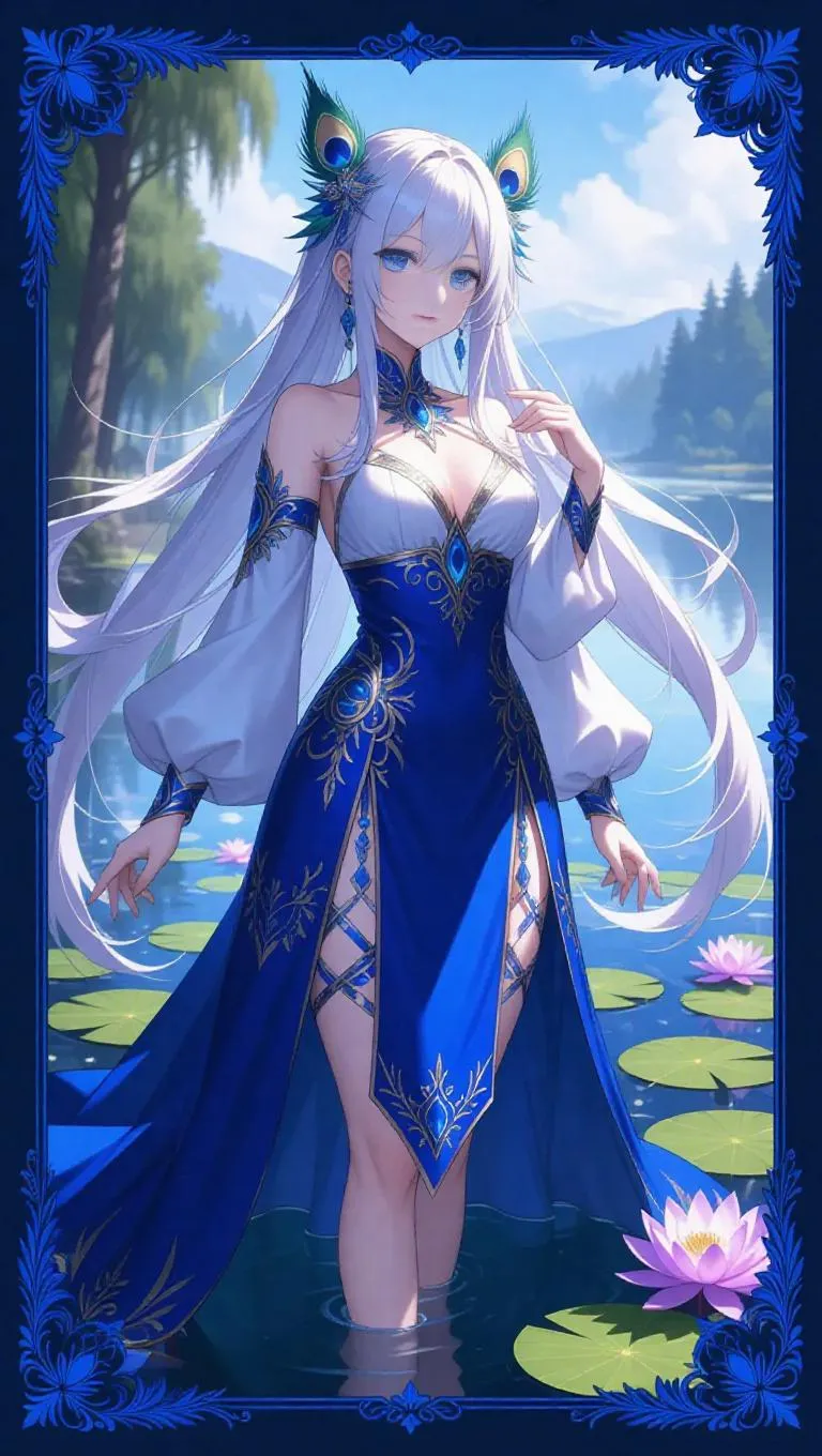 A noble anime-style female druid, adorned in a royal blue and white outfit with intricate feather patterns, stands in an elegant pose. Her long platinum hair is entwined with radiant peacock feathers, and her icy blue eyes radiate grace. The background showcases a serene lakeside with glowing lotus flowers. The scene is framed by an ornate blue border with feather motifs and a subtle shine.