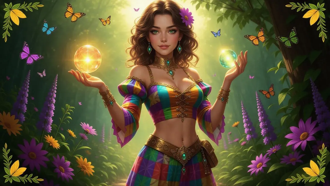 A whimsical sorceress with golden eyes, dressed in a vibrant patchwork outfit and sandals, holds a glowing crystal orb while standing in a magical garden. Bright flowers and fluttering butterflies create a cheerful ambiance. The card border features dragonfly and leaf motifs, accented with green and yellow decorations, and adorned with citrine.