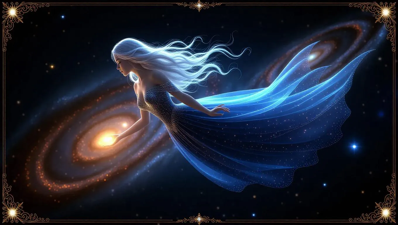 A celestial sorceress floats in space, her long silver hair blending seamlessly with the cosmos. She wears a dress woven from comets, casting radiant star spells from her fingertips. The background features swirling galaxies, while the card is framed with a diamond border adorned with soft glows and glistening textures. Soft, warm light illuminates her from behind, creating a gentle contrast with the dark, star-studded backdrop. The style is otherworldly and fantastical, blending realism with magical elements.