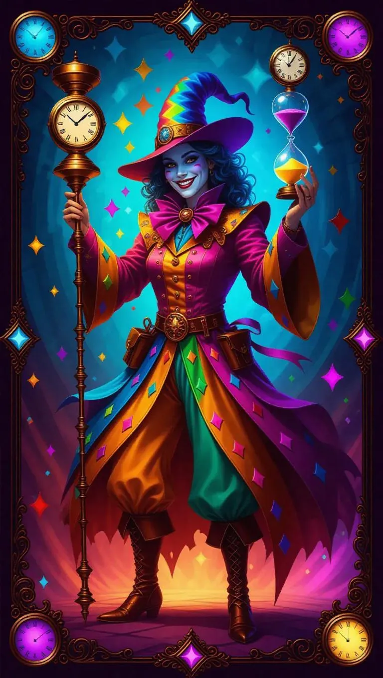 A playful time jester wields a colorful hourglass-shaped staff, their robes shifting through multicolored patterns. Shattered clocks and humorous time distortions fill the background, while the card border sparkles with playful shards, vibrant gradients, and fractal symbols. Bright, festive light casts a lively glow, enhancing the whimsical atmosphere. The style is a blend of whimsical fantasy and carnival art, with bold colors and an exuberant aesthetic.