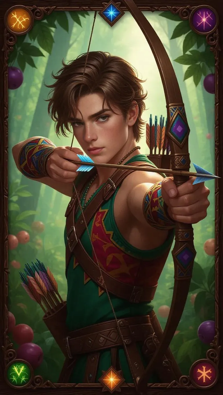 A youthful male archer with tousled brown hair and sharp, focused hazel eyes, clad in a vibrant tribal outfit with a quiver of arrows and a decorated bow. He takes aim, and a magical arrow with a glowing tip is poised for release. The dense forest background features rich foliage and vibrant fruit, framed by a rustic wooden border adorned with tribal patterns and hunting insignias, exuding a natural, earthy texture. Soft lighting, subtle glows, and a sense of adventure create a captivating collectible card game-style image.