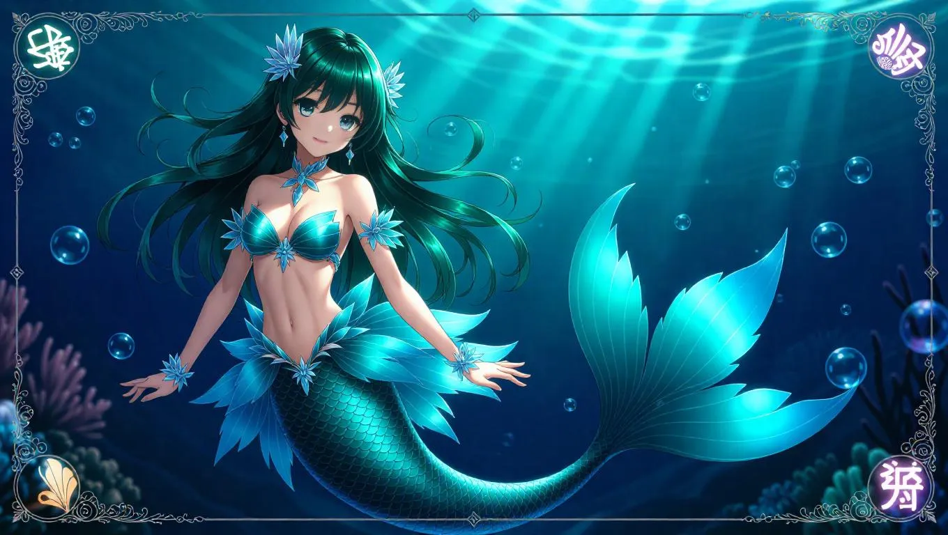 A stunning anime-style female character, adorned in an elegant mermaid dress with shimmering scales and shell accessories, stands in a graceful pose. She has long cascading sea-green hair and enchanting sea-blue eyes. The dynamic background features ocean depths and gentle currents, surrounded by aquatic effects. The scene is framed by a reflective border with sea-themed card lettering and symbols, featuring a lustrous holographic texture. The image is ultra-detailed, highly polished, and vibrant, with serene lighting, bubbles, and oceanic shine, illustrating a masterpiece in the style of collectible card games.