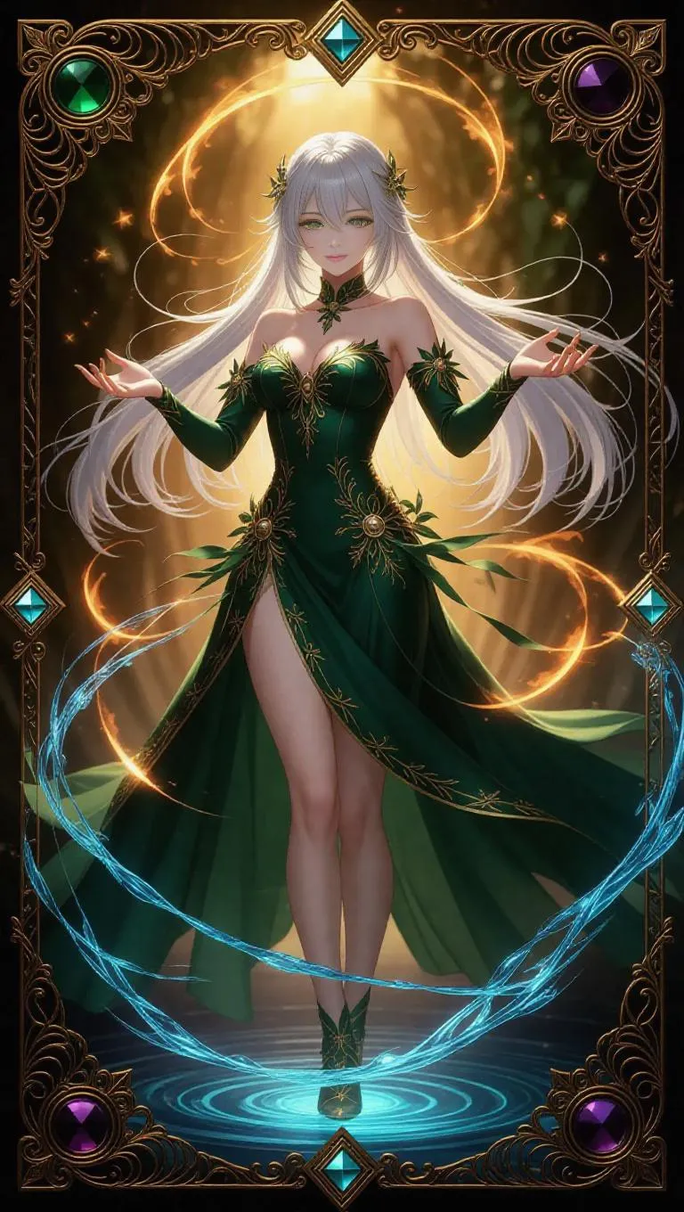 A stunning anime-style female mage, dressed in a flowing dress adorned with forest symbols, stands in a dynamic pose, casting a spell. Her long silver hair glows with a faint warm light, and her piercing green eyes radiate benevolence. Swirling water, fire, and wind elements surround her, with glowing runes dancing through the air. The card border is ornate, with intricate gold filigree, embedded onyx, and holographic shimmer, framed by swirling elemental motifs.