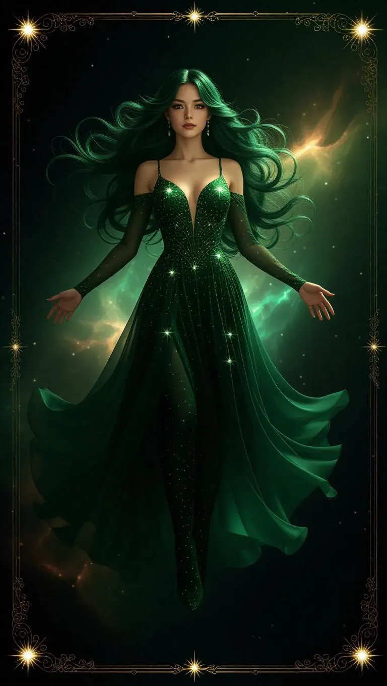 A celestial sorceress floats in space, her long emerald hair blending seamlessly with the cosmos. She wears a dress woven from stars, casting radiant star spells from her fingertips. The background features vibrant nebulas, while the card is framed with a gold border adorned with soft glows and shimmering textures. Soft, cool light illuminates her from the side, creating a gentle contrast with the dark, star-studded backdrop. The style is ethereal and surreal, blending realism with magical elements.