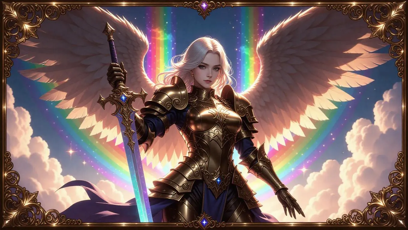 A heroic silver-haired battle angel, clad in radiant bronze armor and adorned with luminescent wings, holds a divine sword aloft. Rainbow beams and fluffy clouds fill the background, creating a dreamlike atmosphere. The card is bordered with ornate patterns, featuring shimmering sparkles and bronze holographics, enhancing the divine aura.