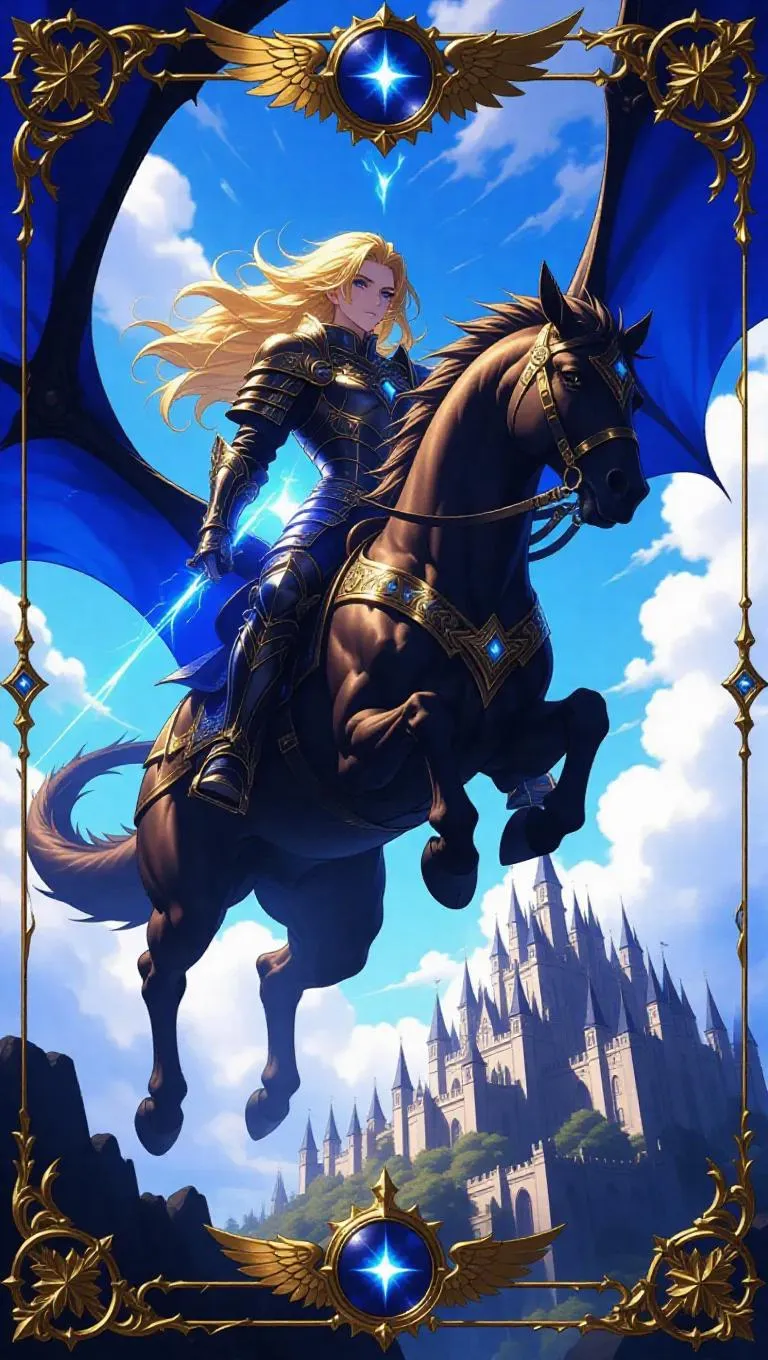 A noble dragon rider with flowing gold hair and a blue aura soars through dark energy. His armor glints as energy streams rush around him. The scene is set against a bright sky with fluffy clouds, with a distant castle in the background. The card is framed with majestic gold borders, adorned with dragon icons and wing emblems, creating a high-quality SSR rider card effect. The lighting is vibrant and uplifting, casting radiant highlights and enhancing the heroic action. The style is a mashup of adventure and high fantasy aesthetics.