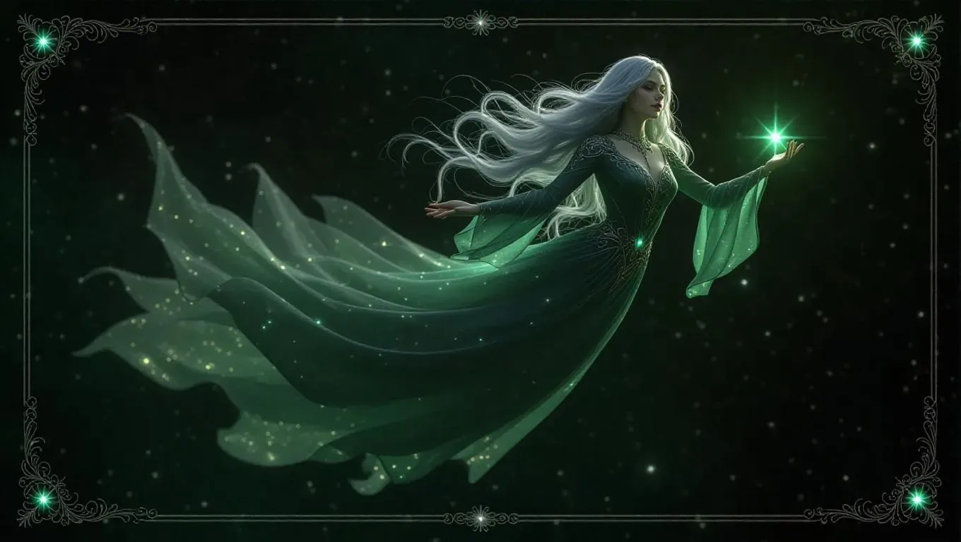 A celestial sorceress floats in space, her long ash-grey hair blending seamlessly with the cosmos. She wears a dress woven from auroras, casting radiant star spells from her fingertips. The background features glowing star clusters, while the card is framed with a silver border adorned with soft glows and opalescent textures. Soft, green light illuminates her from above, creating a gentle contrast with the dark, star-studded backdrop. The style is ethereal and otherworldly, blending realism with magical elements.