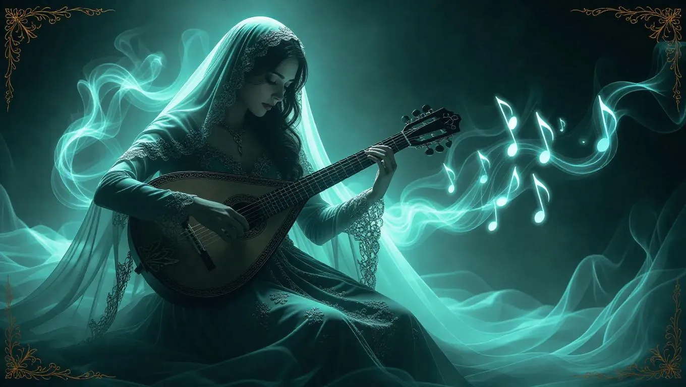 A mystical lute player in shimmering gowns plays a cursed melody, summoning swirling energies and ghostly lights. The scene is shrouded in dark fog, framed by ethereal borders adorned with musical icons. Soft, dappled light enhances the magical quality of the gowns and spirits, creating a hauntingly beautiful atmosphere. The style is magical and mysterious, blending realism with supernatural elements.