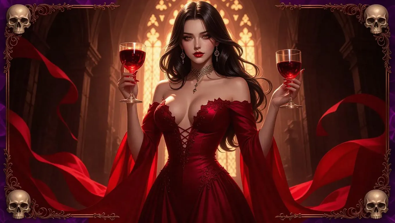 A seductive vampire with fiery orange lips, wearing a stunning red gown with deep cuts, holds an elaborate goblet of blood. Standing in a haunted castle filled with echoes, surrounded by cobwebs and streaming shadows. The card border integrates skull and ivy motifs, accented with dark purple and gold decorations, and adorned with dazzling quartz.