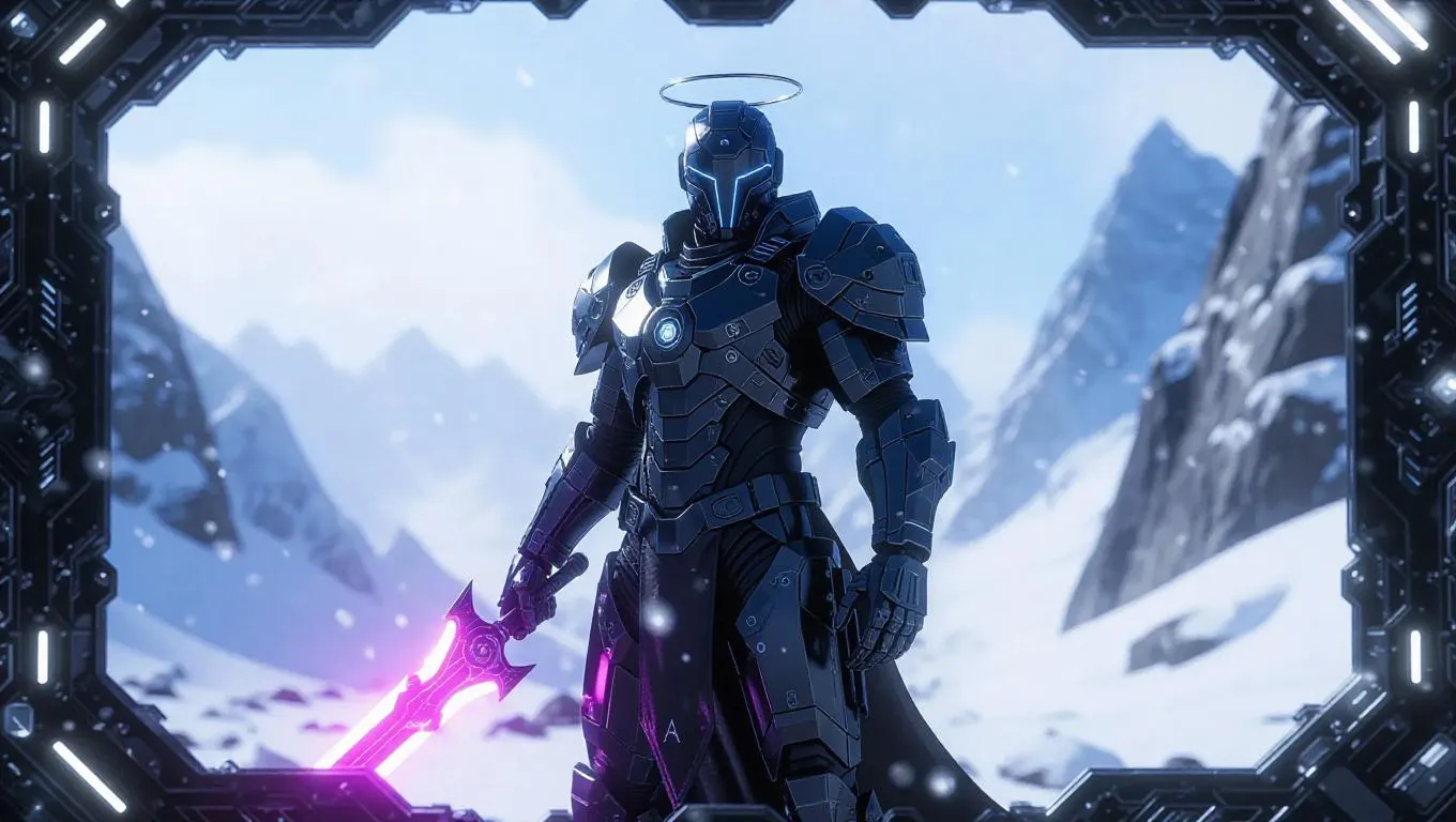 A futuristic cyber-paladin stands in rugged black armor against an icy wasteland. He wields a glowing plasma blade and wears a halo of illuminated circuits. The scene is set under a stormy sky, with snow swirling and jagged cliffs casting vibrant hues. Soft side light enhances the metallic sheen of his armor, creating a balance of highlights and shadows. The card border features angular sci-fi patterns with a white-and-silver shine, adorned with mecha emblems. Style: Cyberpunk.