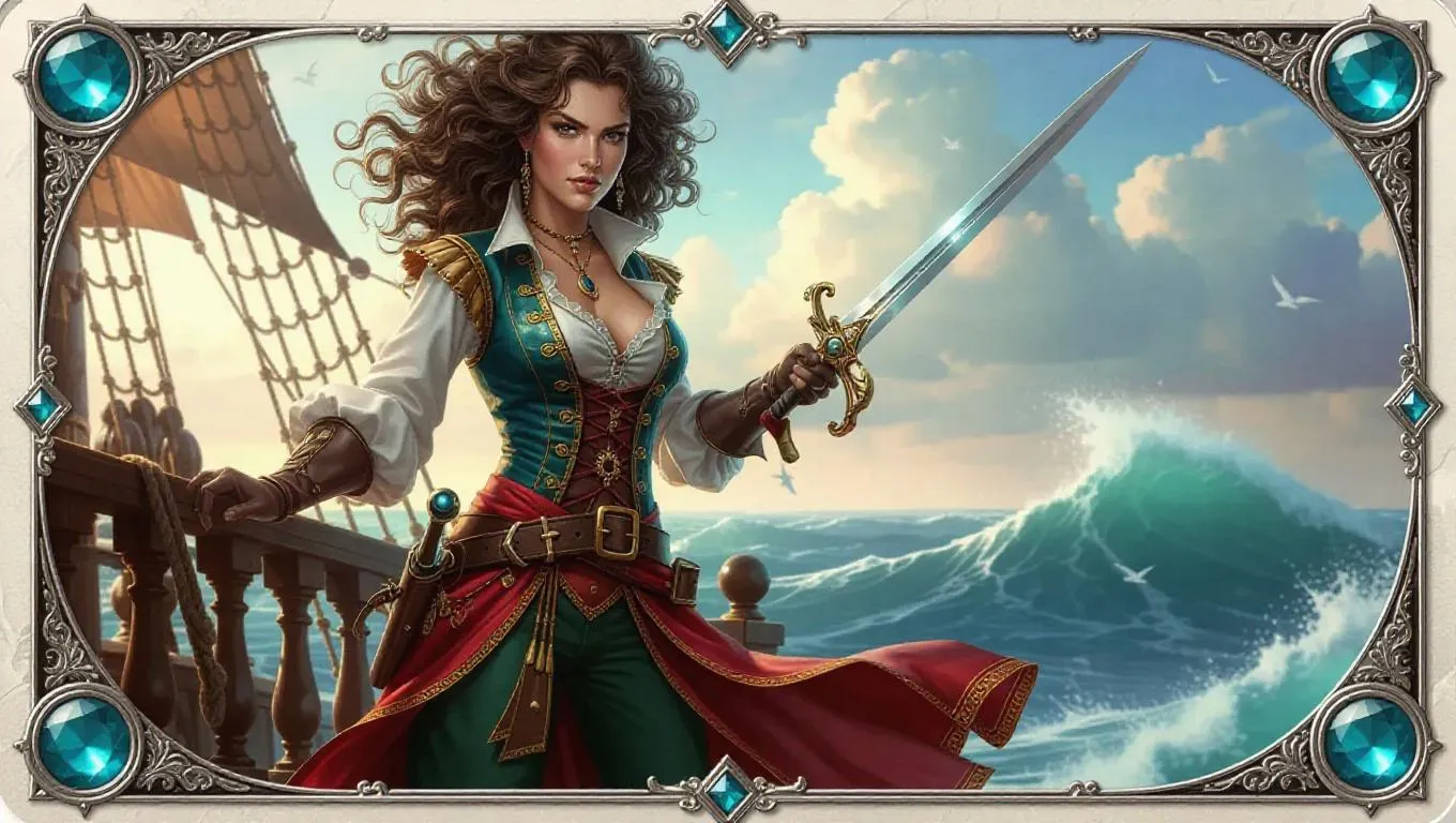 A wild pirate queen with unruly hair, donned in a rugged vest and flowing skirts, exuding fierceness and independence. She holds a flamboyant sword while standing at the edge of her ship's balcony, with churning waves and dramatic skies providing an adventurous setting. The card border highlights intricate compass roses and nautical stars, framed in silver and teal colors, and set with brilliant turquoise gemstones.
