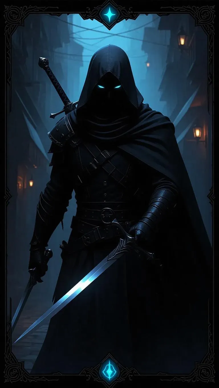 A mysterious masked assassin stands shrouded in shadow mist, holding twin blades of void. His glowing cyan eyes pierce through the darkness. Dark alleyways and ghost-like silhouettes form the background. The scene is bathed in cool, dim light, enhancing the eerie atmosphere. The card features stealth-themed silver-on-black accents with razor-sharp borders, adding a sharp, menacing edge. Style: Dark fantasy.