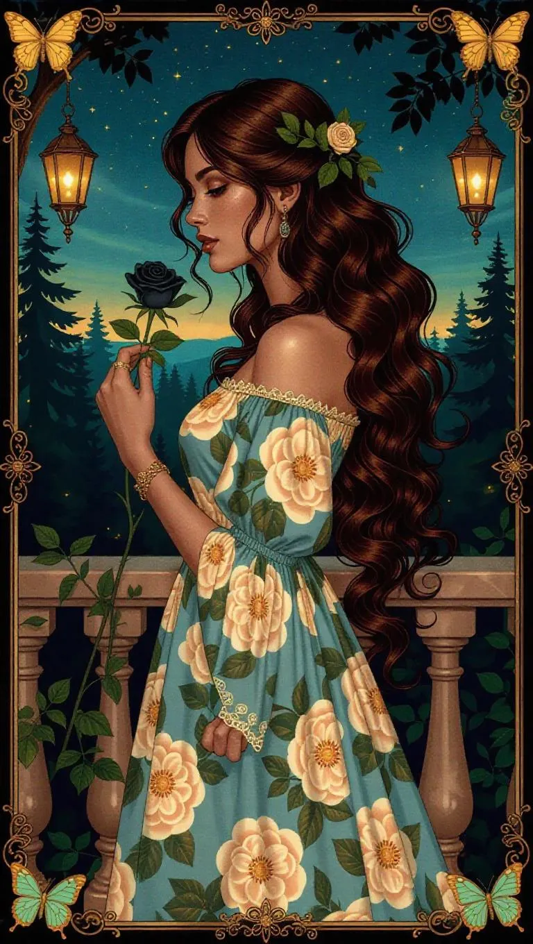 A mysterious queen with layered sun-kissed hair, wearing a flowing gown with a floral print, holds a black rose while standing on a quaint balcony overlooking a starry night sky. The background showcases a lush, enchanted forest with glimmering lanterns. The card border features cheerful butterfly and star motifs, accented with pastel blue and yellow decorations, and adorned with sparkling peridots.