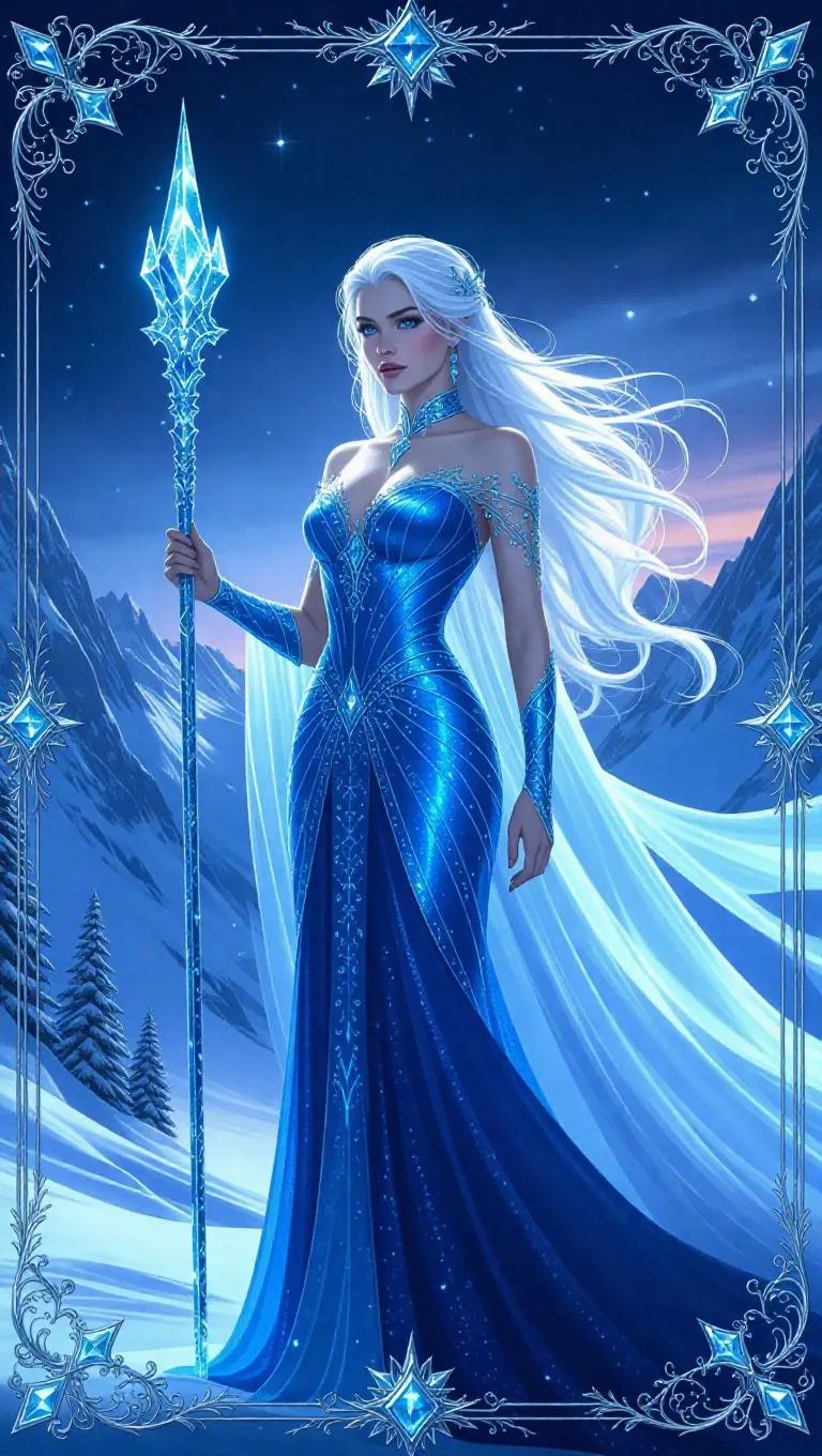 A regal ice queen with loose flowing white and blue hair, adorned in a crystal gown that shimmers like fresh snow. She holds a sparkling ice scepter, standing majestically on a pristine glacier. Snow-covered peaks and a twilight sky create a magical backdrop. The card border features intricate tree and star designs, accented with blue and silver, and embellished with glimmering gems.