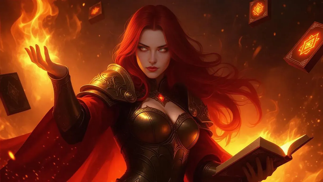 A powerful female mage with long crimson hair and glowing orange eyes casts a fiery spell, surrounded by floating spellbooks and burning runes. The background is a storm of flames and ash, with a collectible game card design featuring an ornate golden frame, legendary fire-element symbols, ultra-detailed armor, and a shimmering holographic texture. The lighting is dramatic, with intense highlights from the flames and soft shadows from the ash, creating a warm and intense atmosphere. The style is highly detailed and fantastical, blending realism with magical elements.