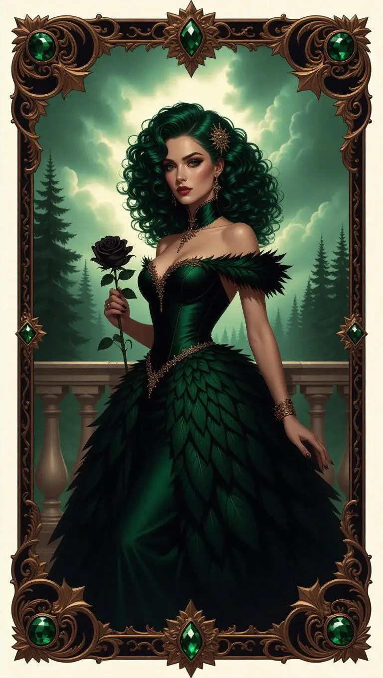 A mysterious queen with curly green hair, wearing a structured gown with feather details, holds a black rose while standing on a majestic balcony overlooking a stormy sky. The background showcases a wild, enchanted forest with swirling mist. The card border features fierce fire and star motifs, accented with dark green and gold decorations, and adorned with sparkling emeralds.